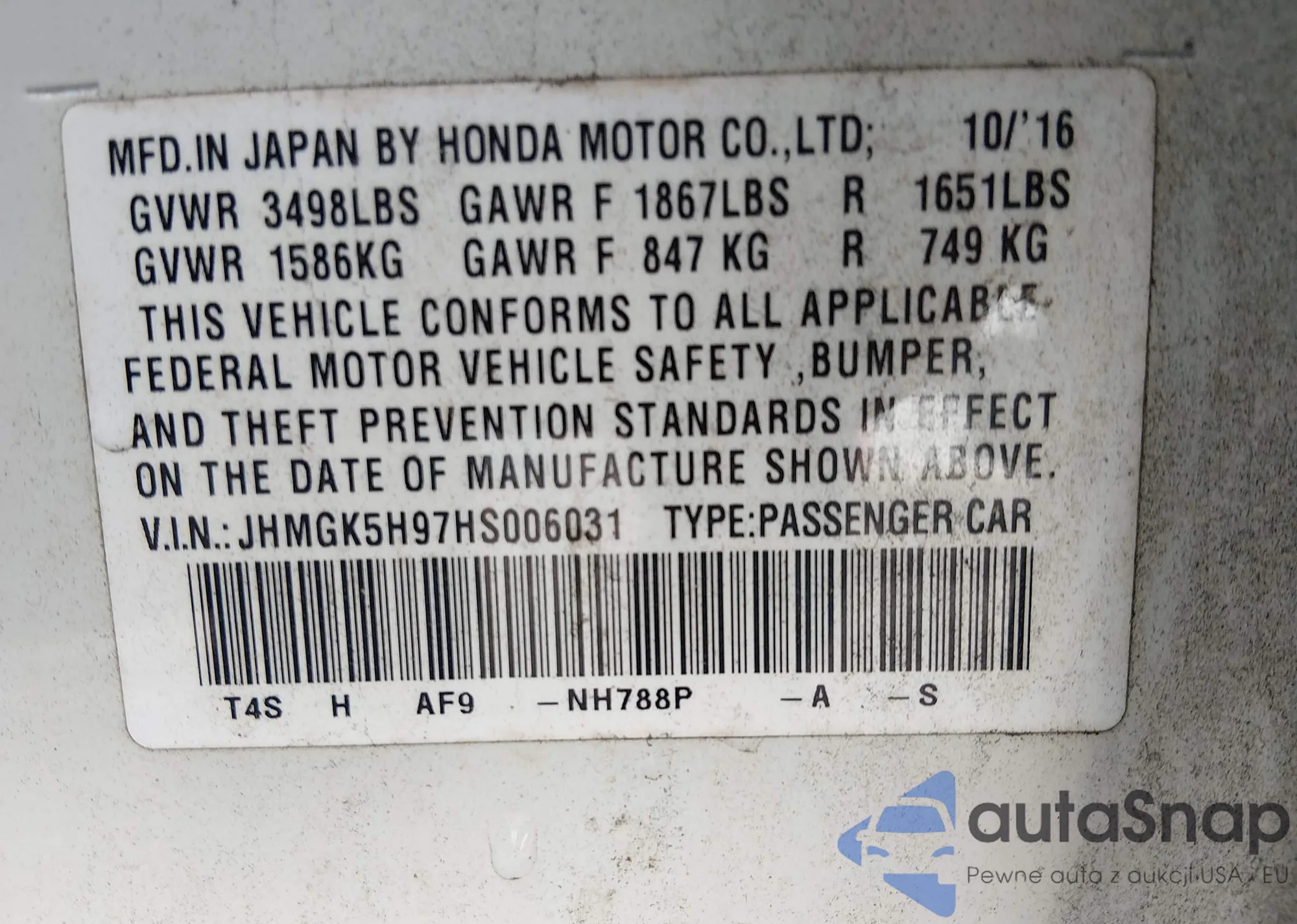 LOT: 44228944 VIN: JHMGK5H97HS006031