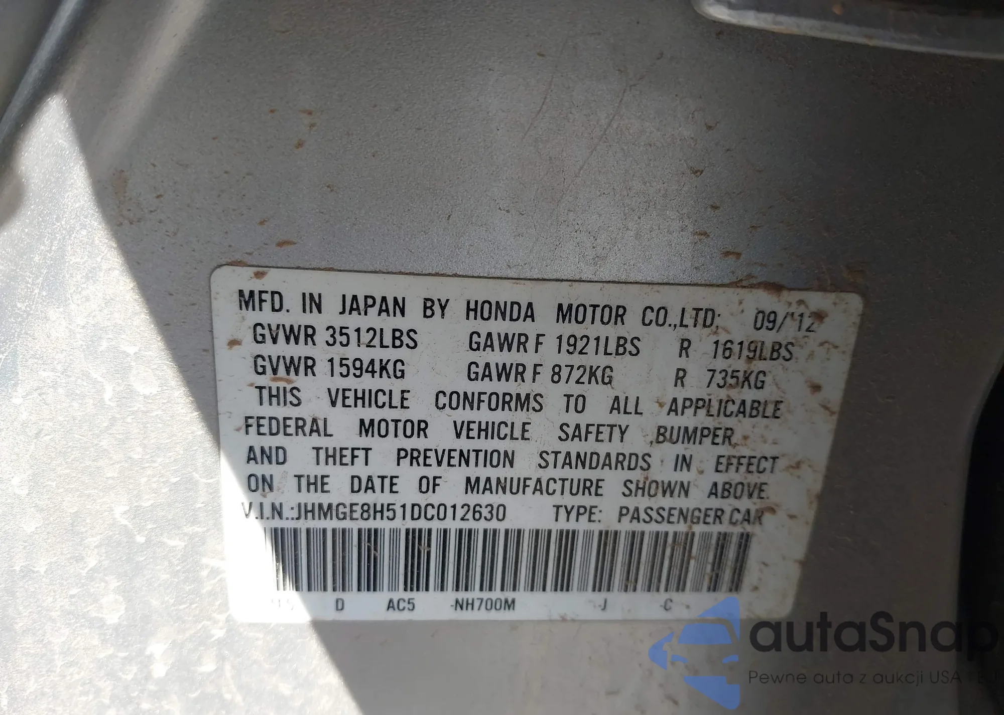 • VIN JHMGE8H51DC012630