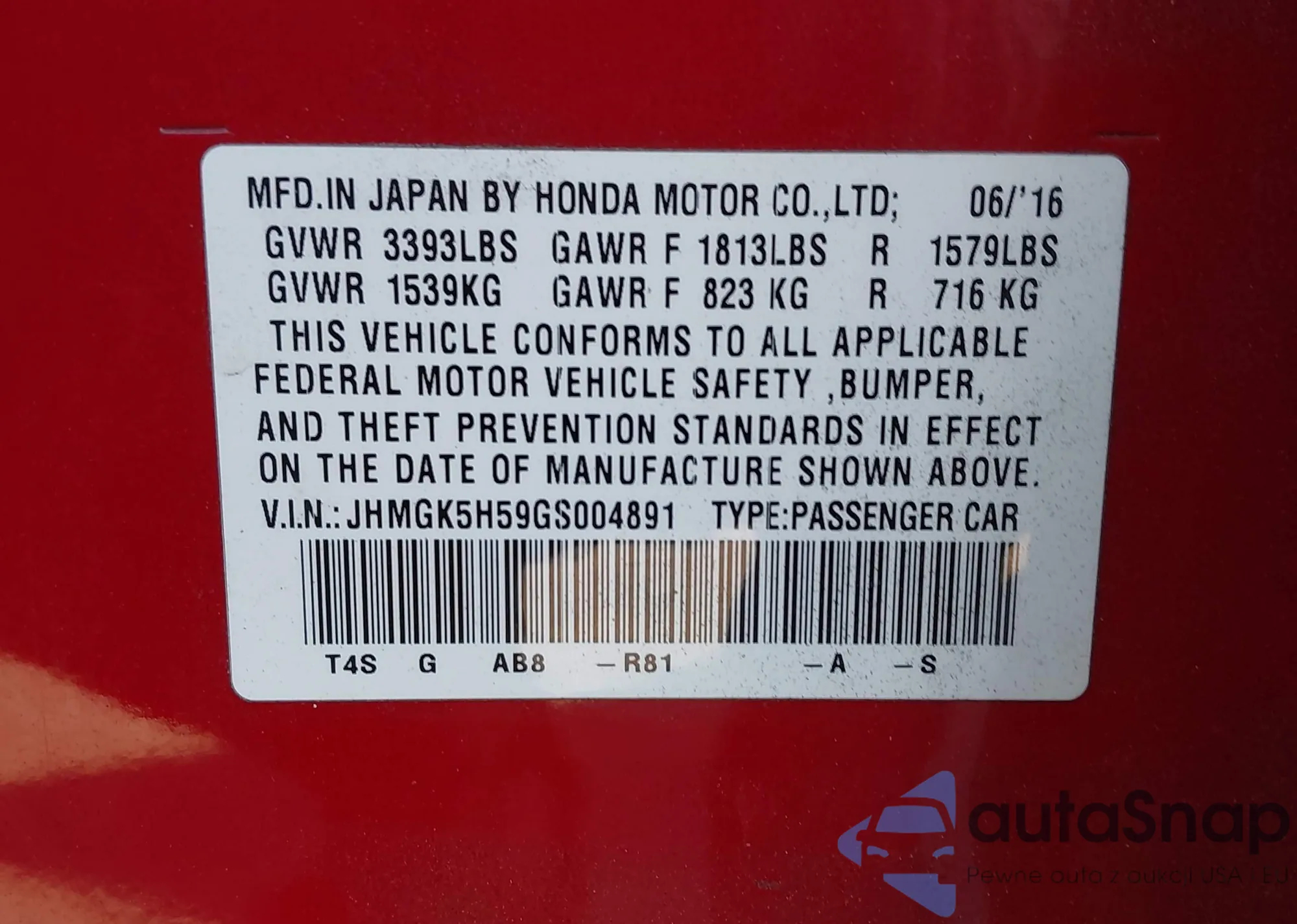 LOT: 44202004 VIN: JHMGK5H59GS004891