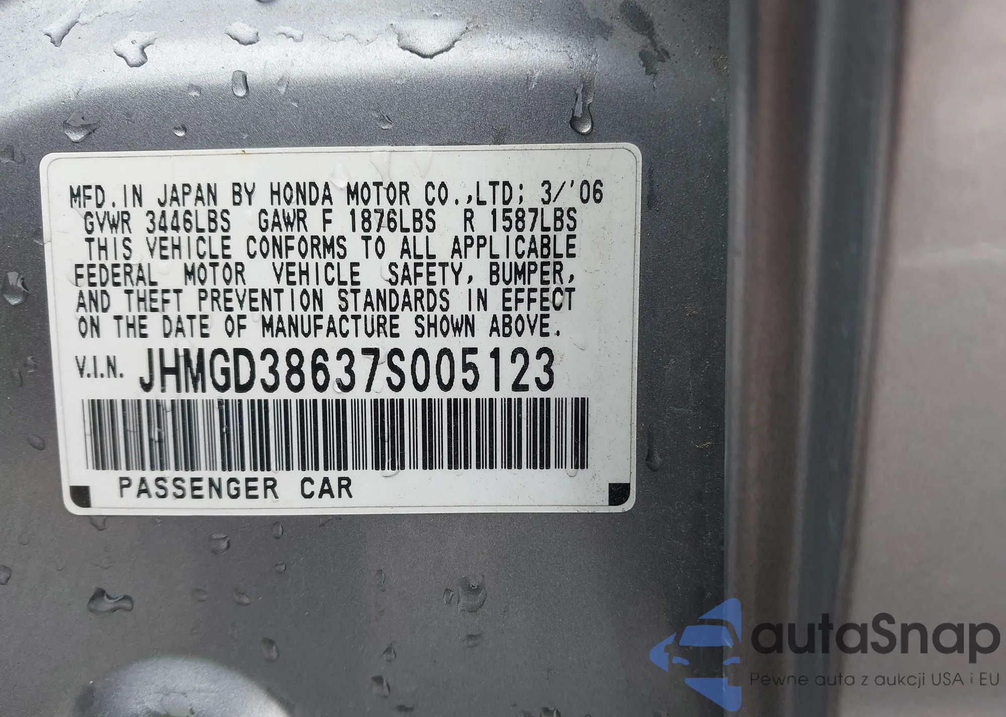 LOT: 63761415 VIN: JHMGD37617S006885