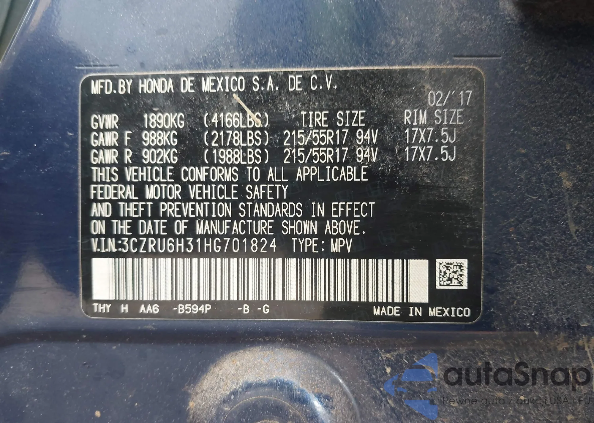 • VIN 3CZRU6H31HG701824