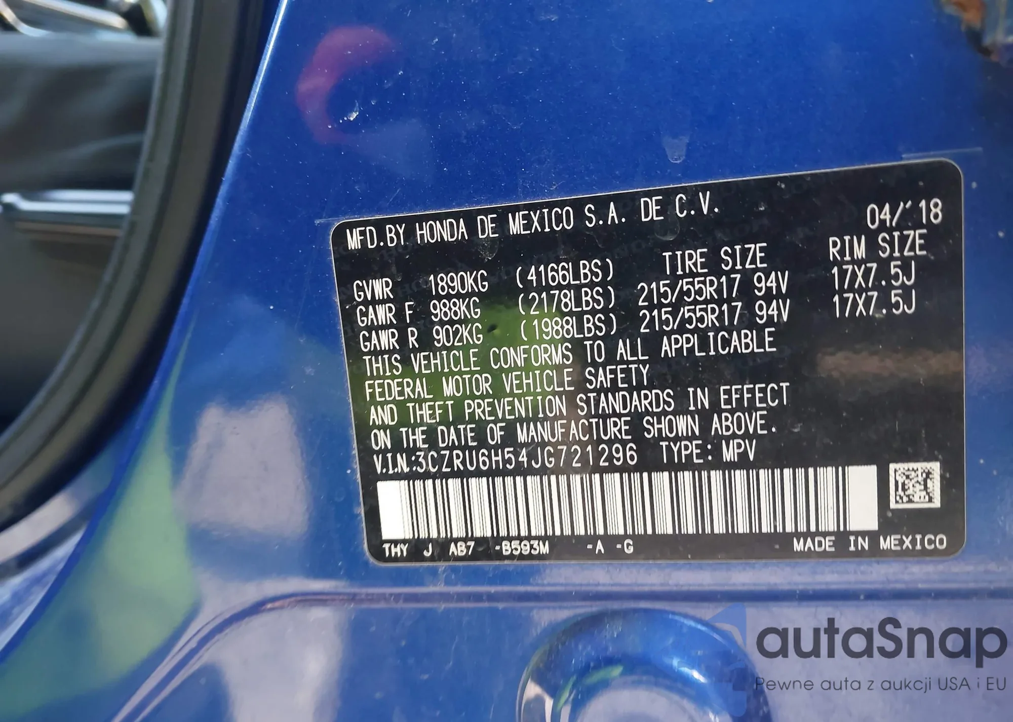 • VIN 3CZRU6H54JG721296