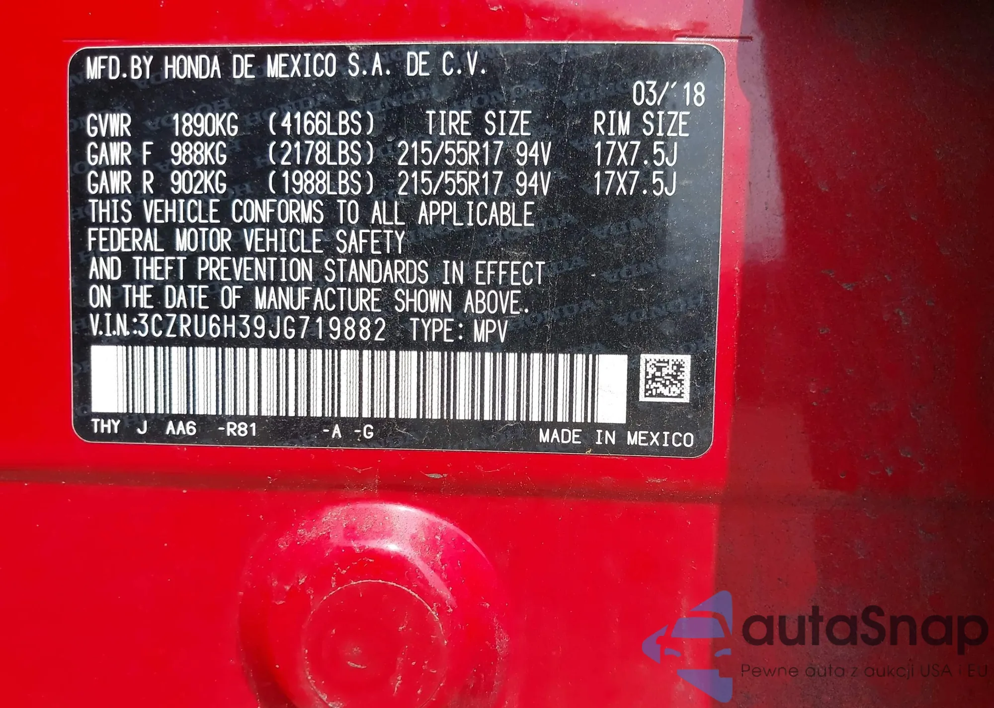 • VIN 3CZRU5H39JM708439