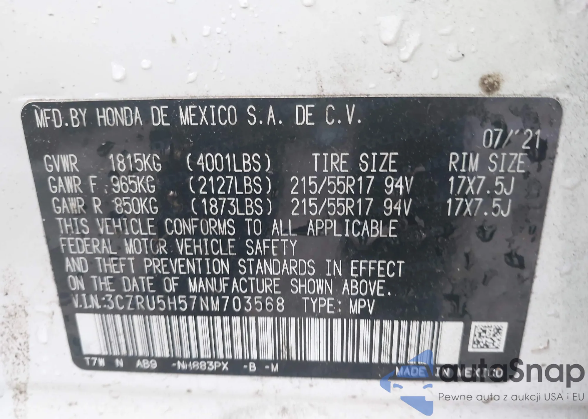 • VIN 3CZRU6H57MM731147