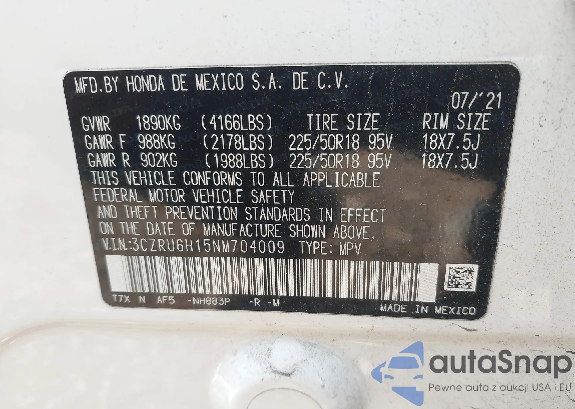 • VIN 3CZRU6H15NM704009