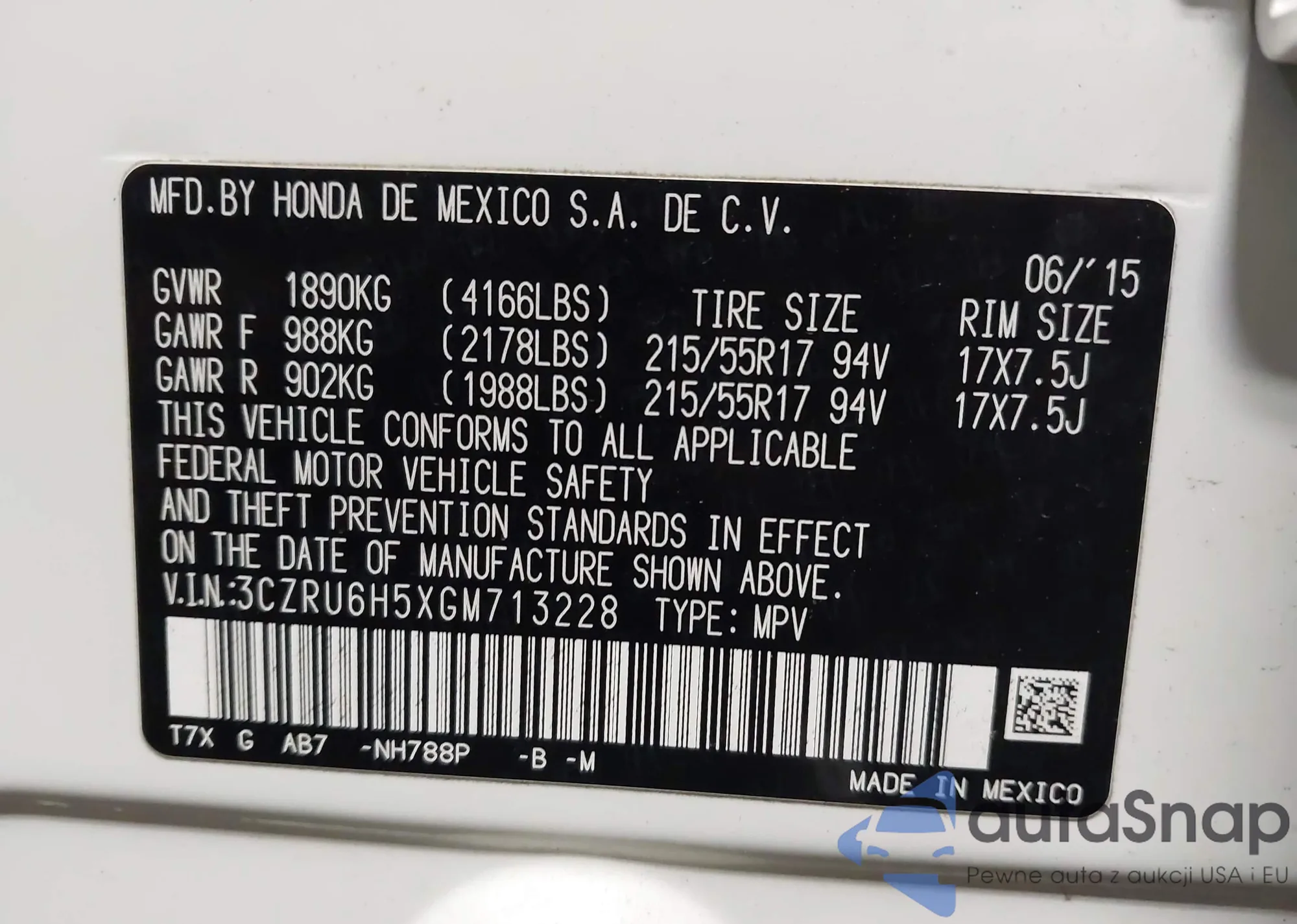 • VIN 3CZRU6H5XGM713228