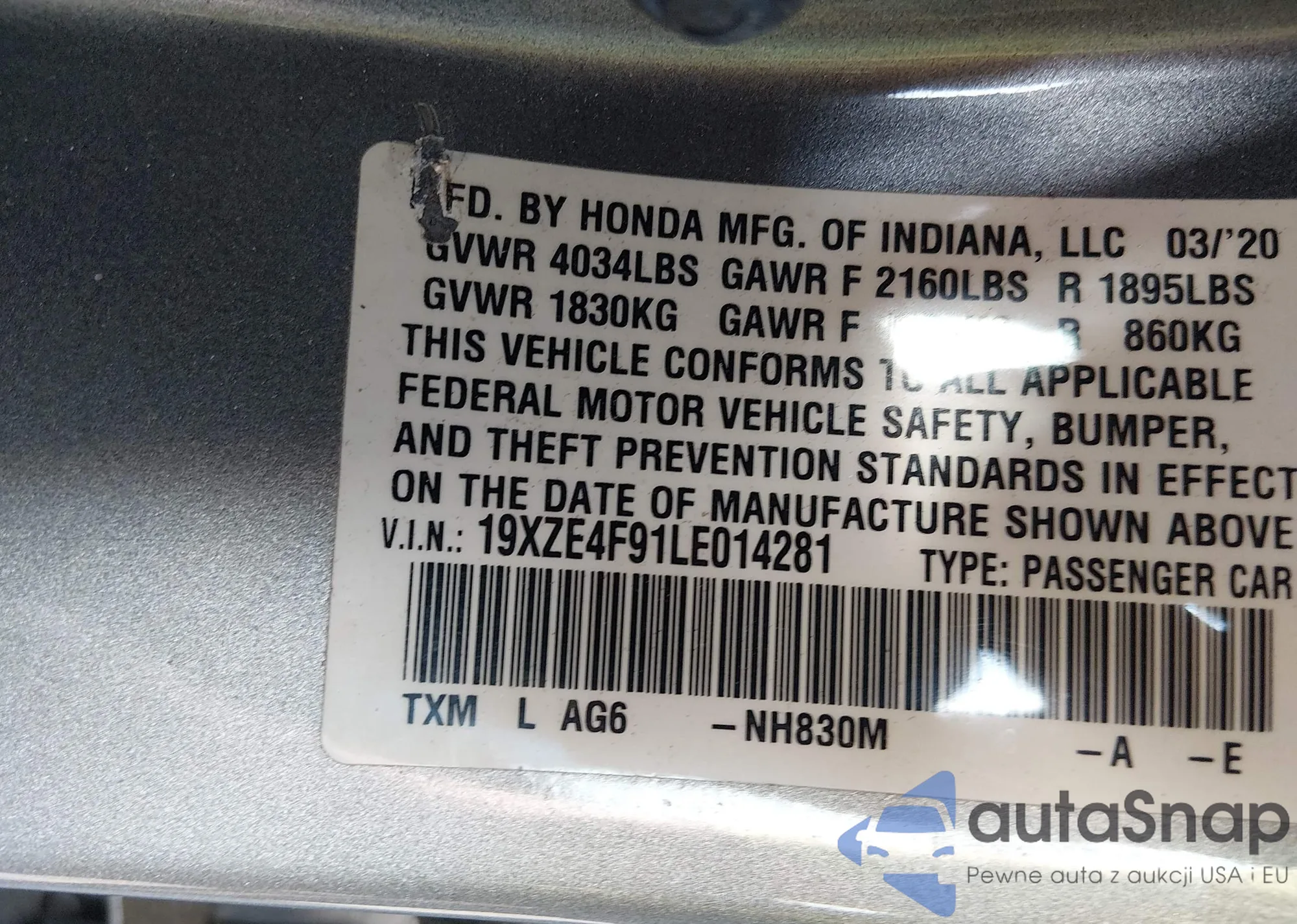 LOT: 44570442 VIN: 19XZE4F91LE014281