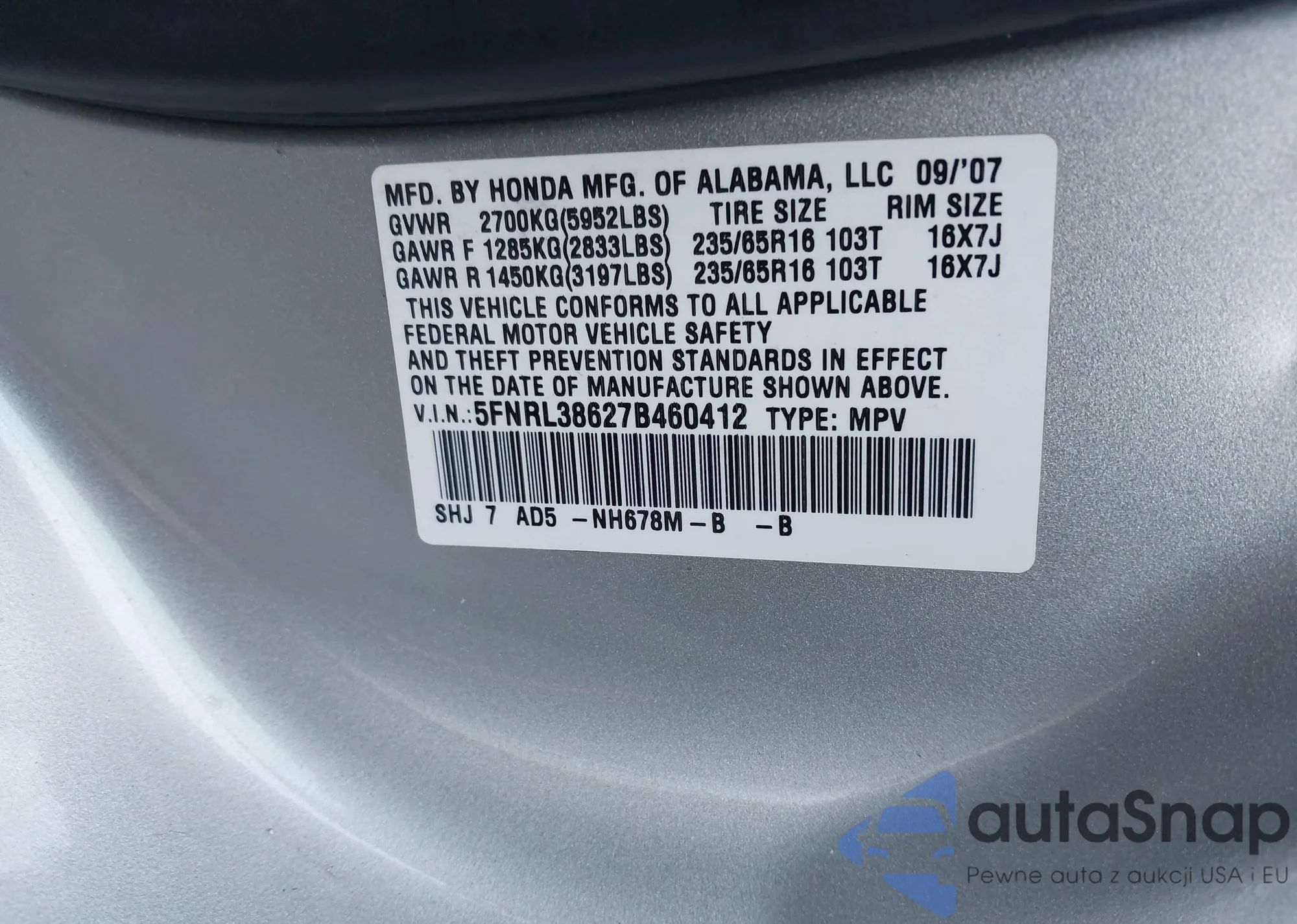 • VIN 5FNRL38627B460412