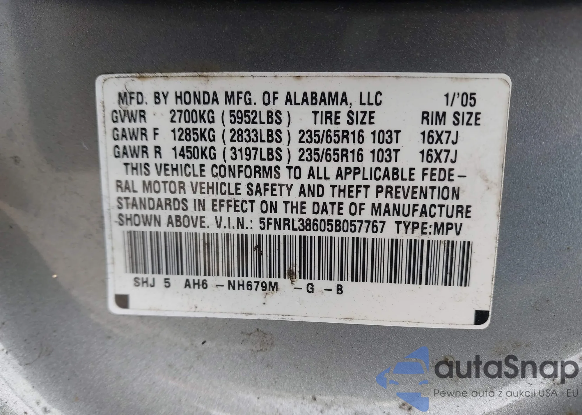 • VIN 5FNL38715B006969