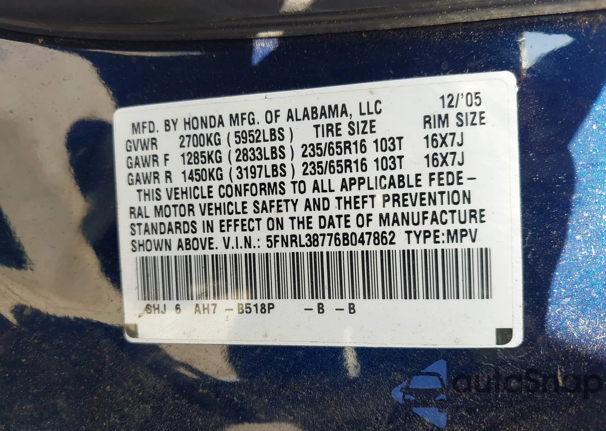 • VIN 5FNRL38776B047862