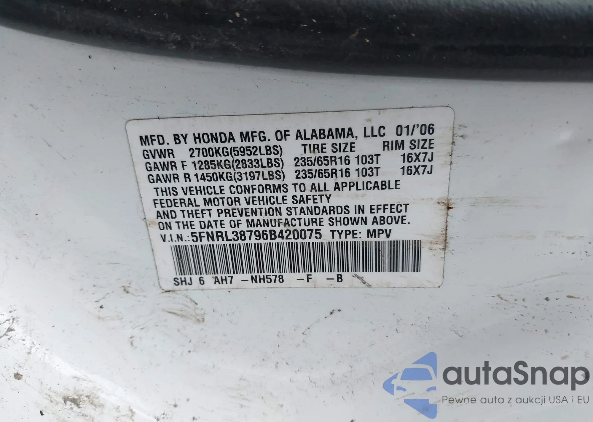 • VIN 5FNRL38796B420075