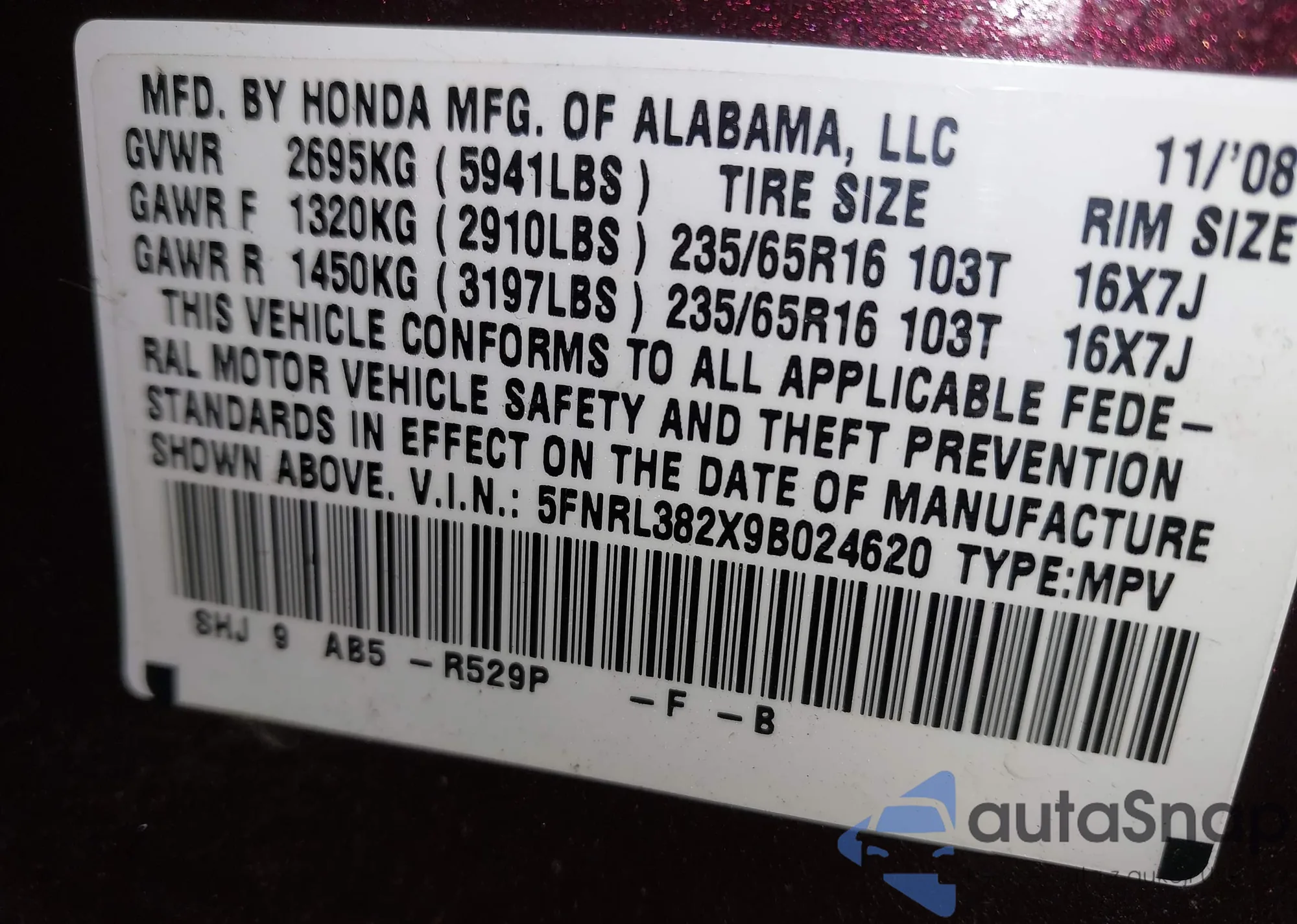 • VIN 5FNRL5H98BB067612