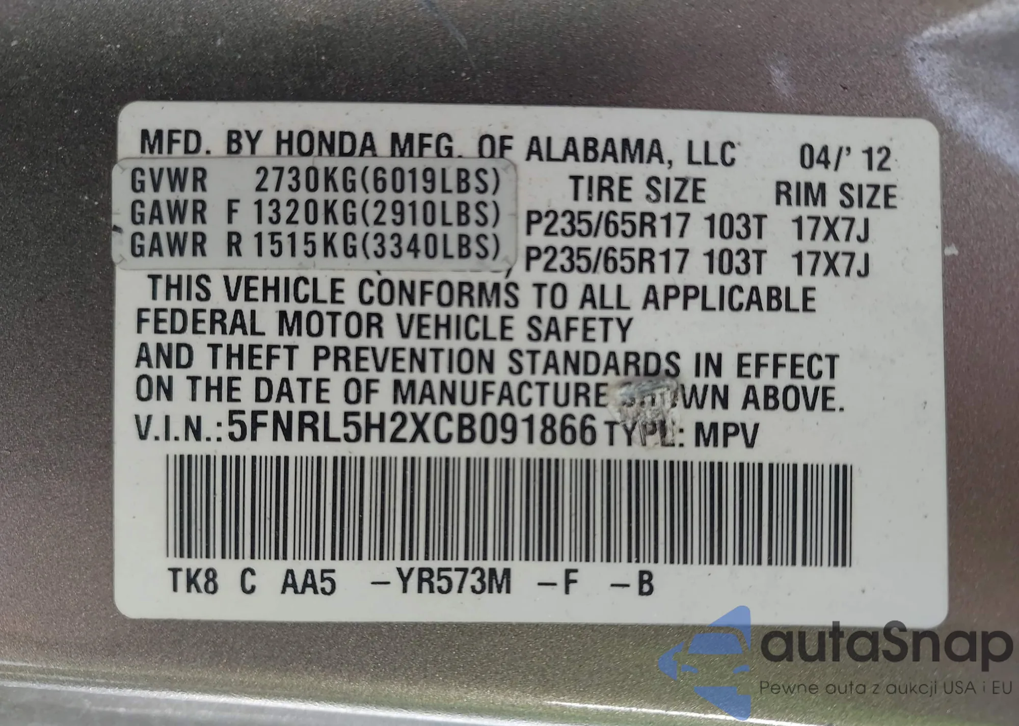 • VIN 5FNRL5H2XCB091866