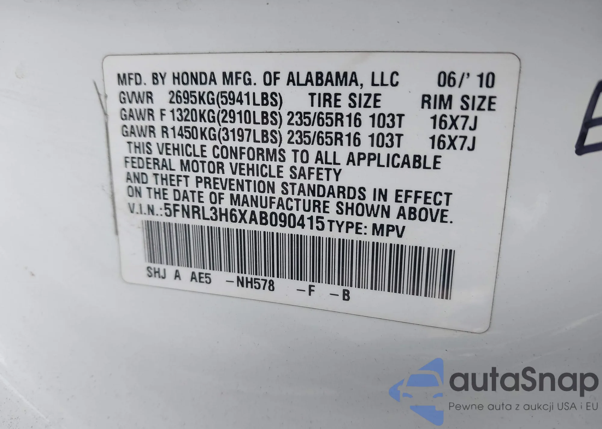 • VIN 5FNRL3H6XAB090415