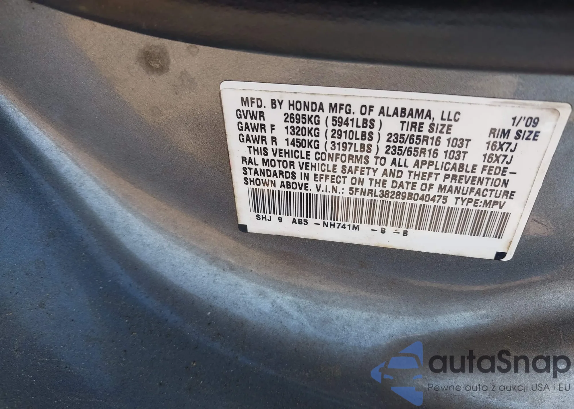 LOT: 44384728 VIN: 5FNRL38289B040475