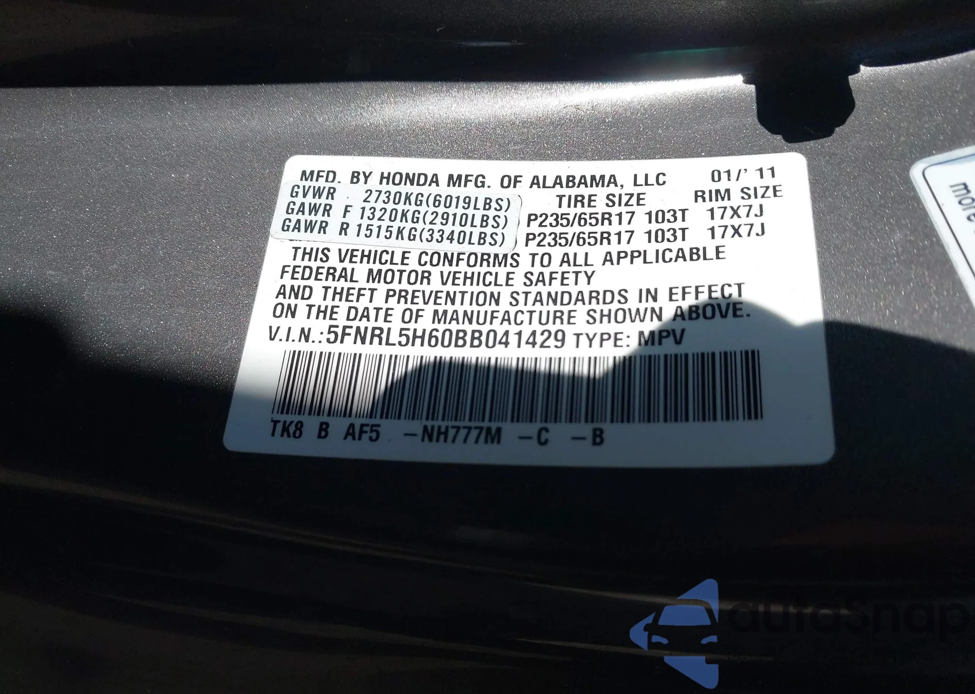 • VIN 5FNRL5H60BB041429