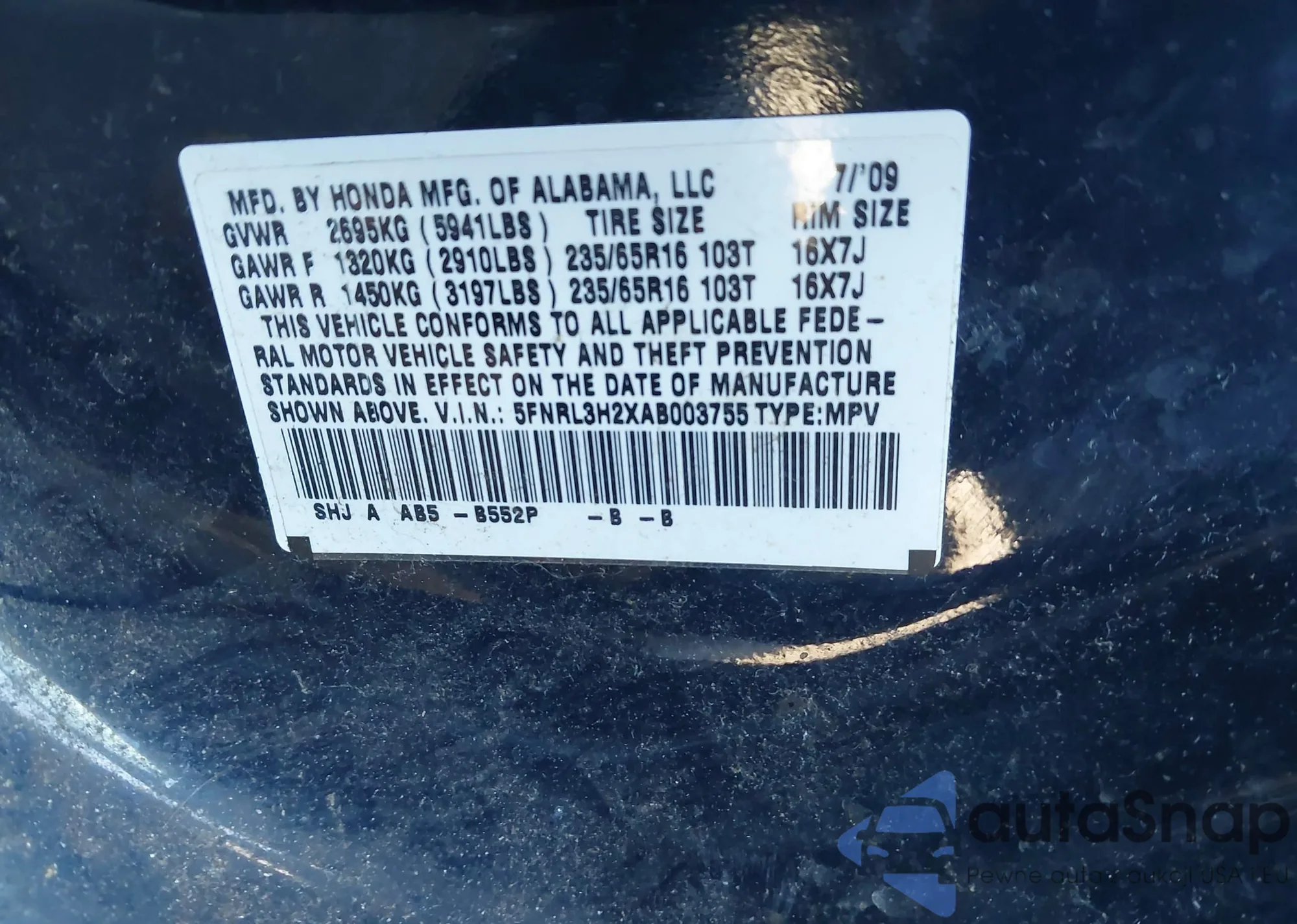 • VIN 5FNRL3H2XAB003755