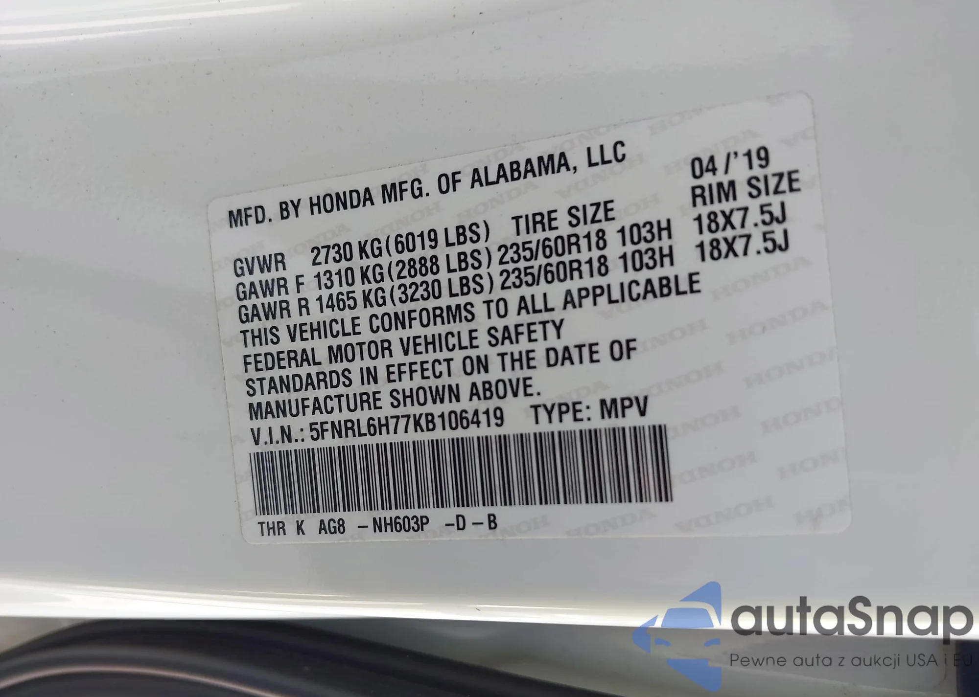 • VIN 5FNRL6H77KB106419