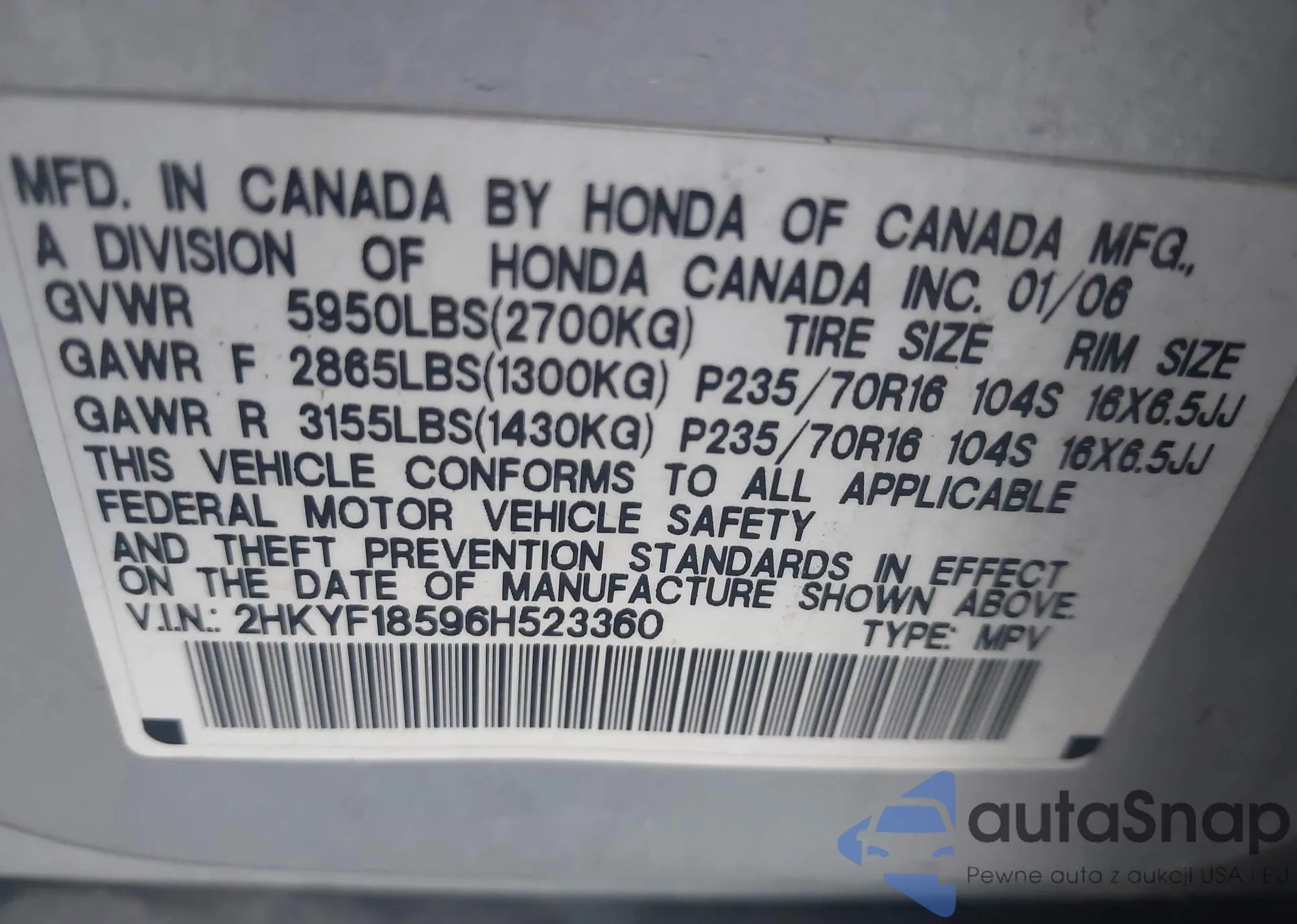 LOT: 44165816 VIN: 2HKYF18596H523360