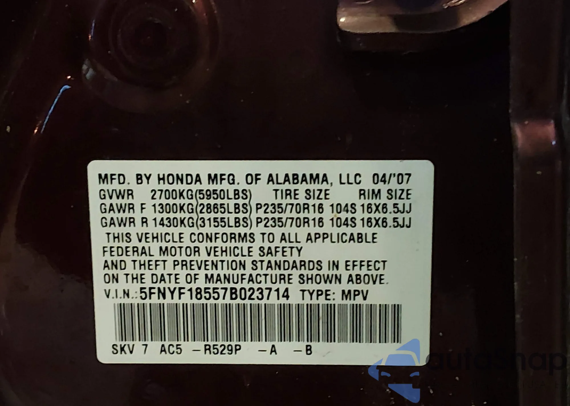 LOT: 44166506 VIN: 5FNYF18557B023714