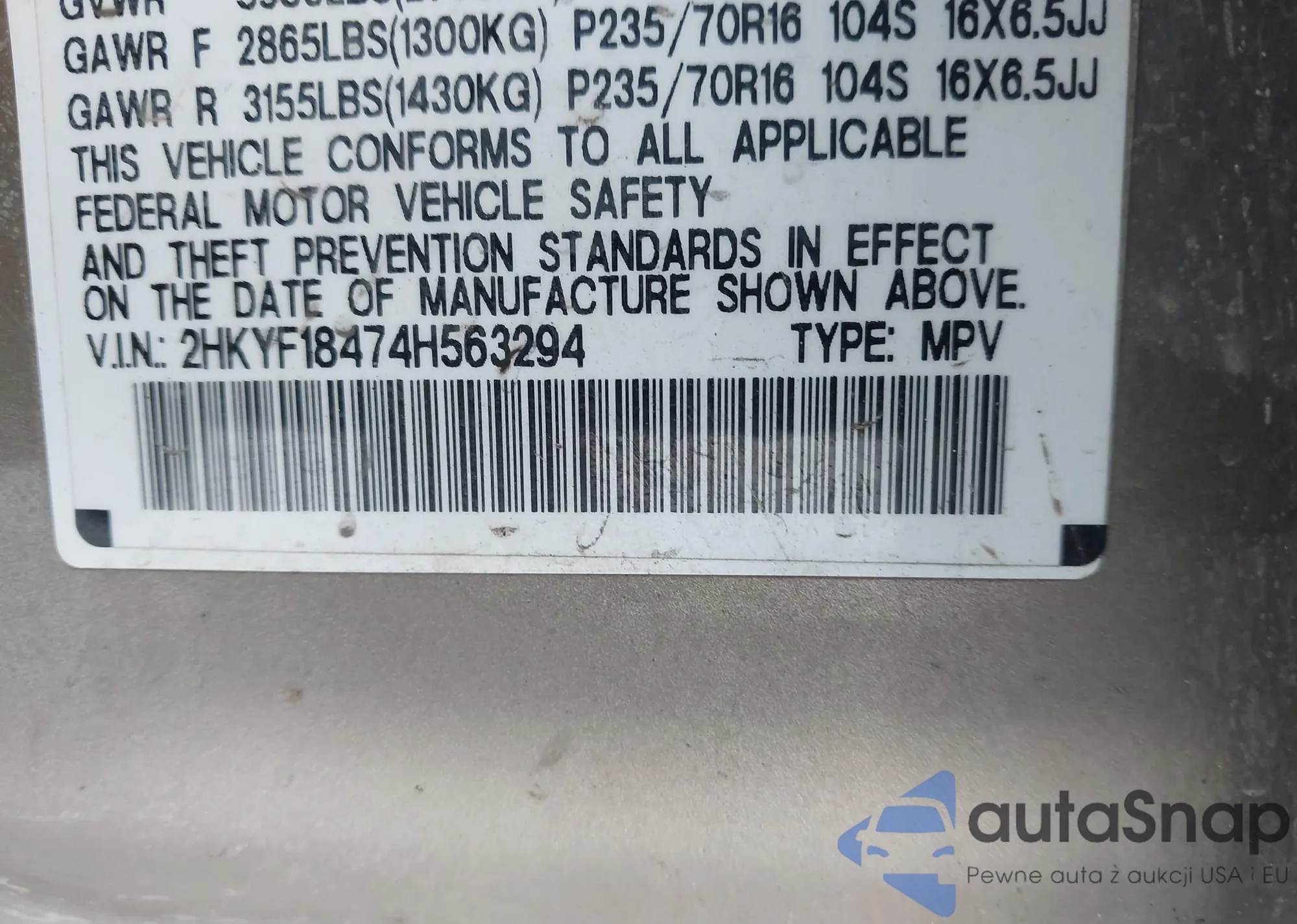 • VIN 2HKYF18474H563294