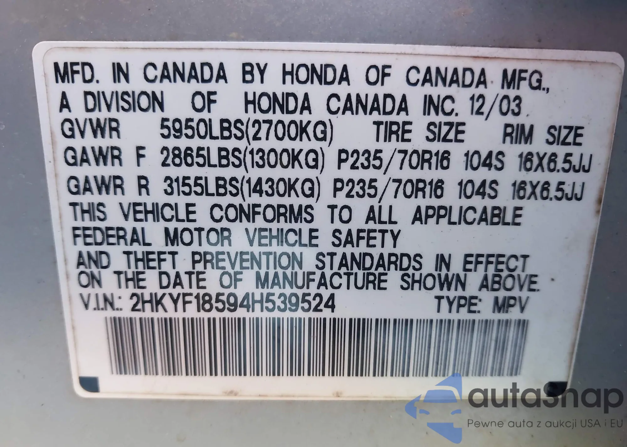• VIN 2HKYF18594H539524