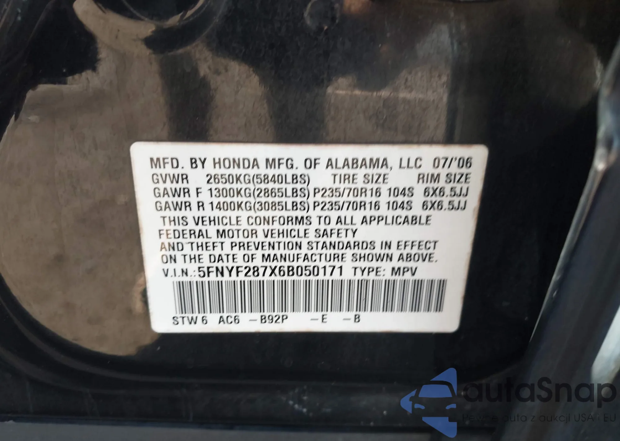• VIN 5FNYF287X6B050171