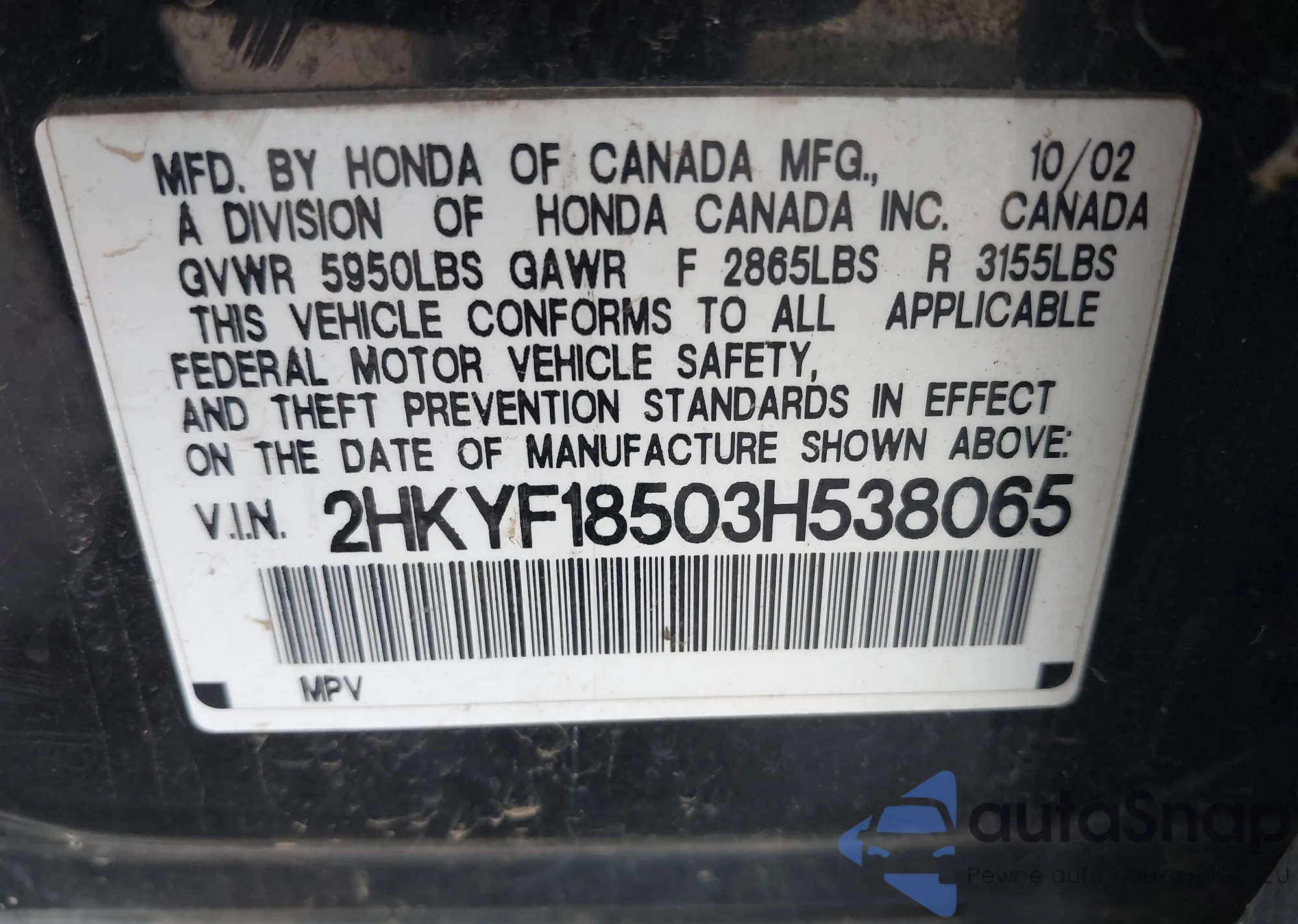 • VIN 2HKYF18503H538065