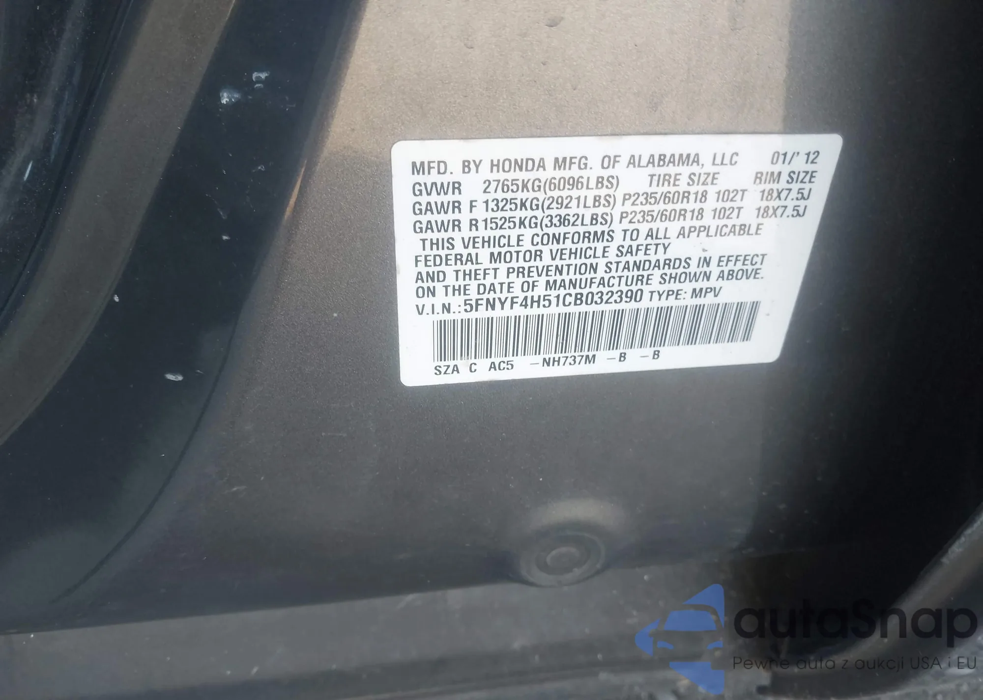 • VIN 5FNYF4H51CB032390
