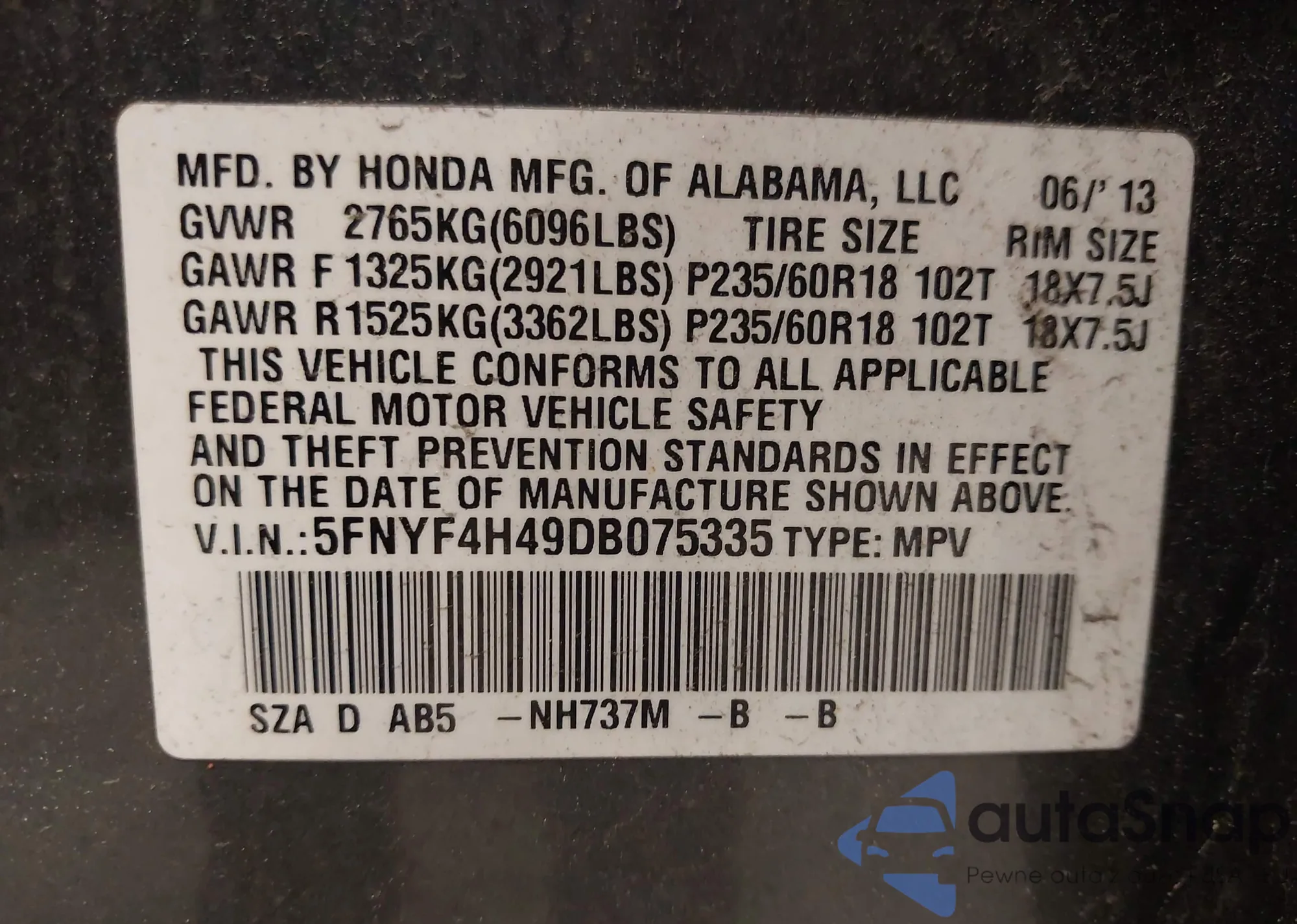 • VIN 5FNYF4H57DB066917