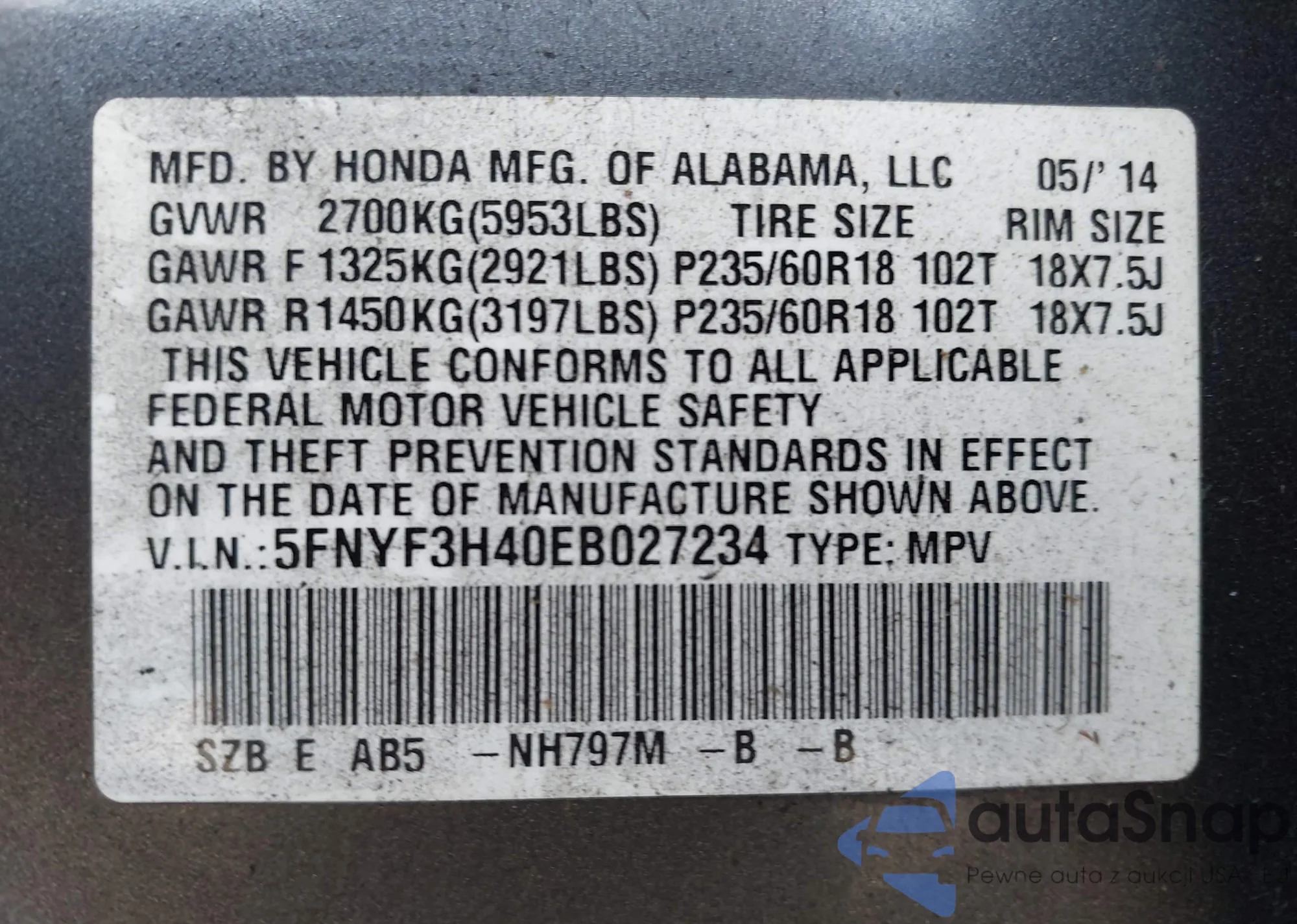 LOT: 42439828 VIN: 5FNYF4H57EB008856