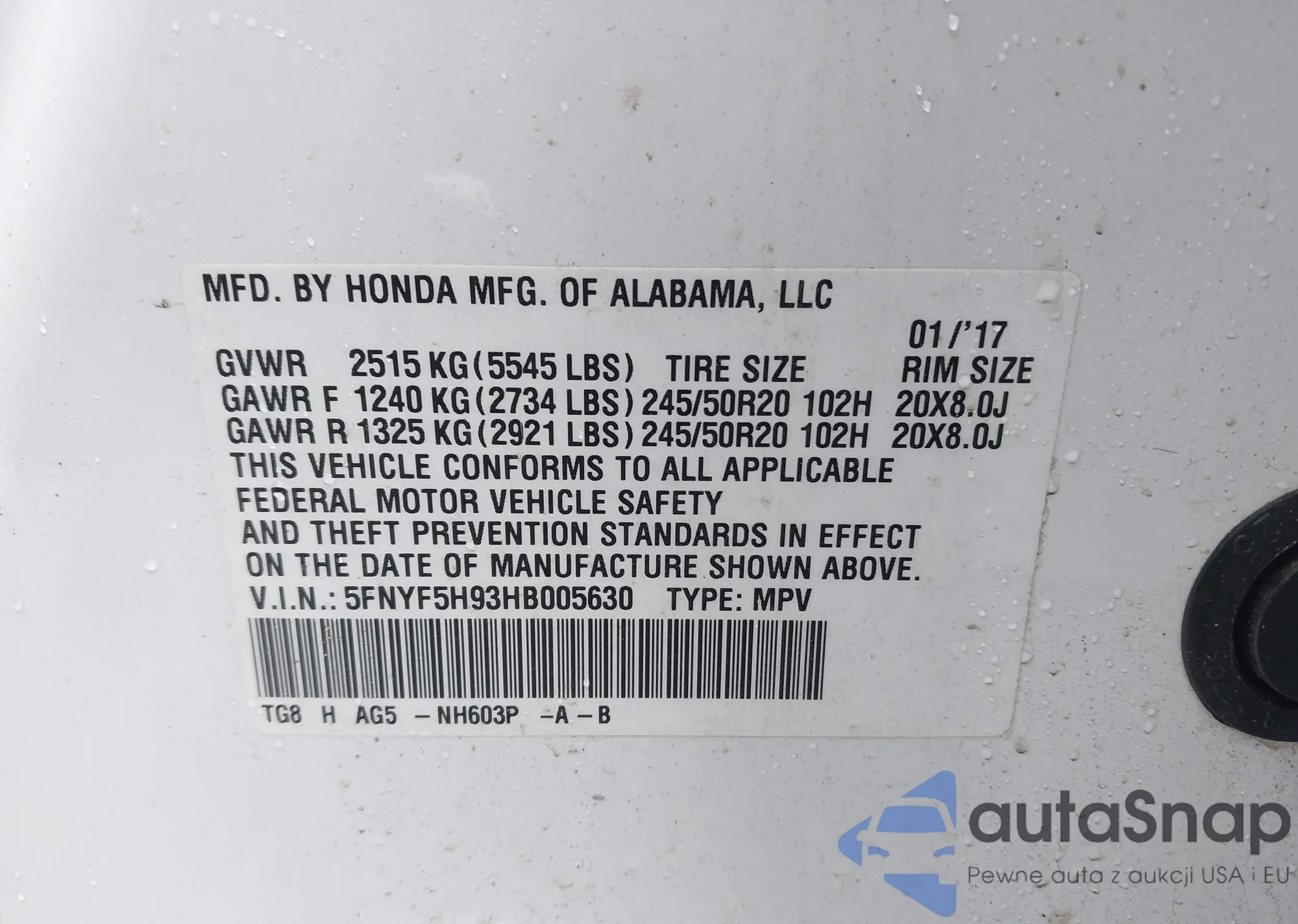 LOT: 43909704 VIN: 5FNYF5H93HB005630