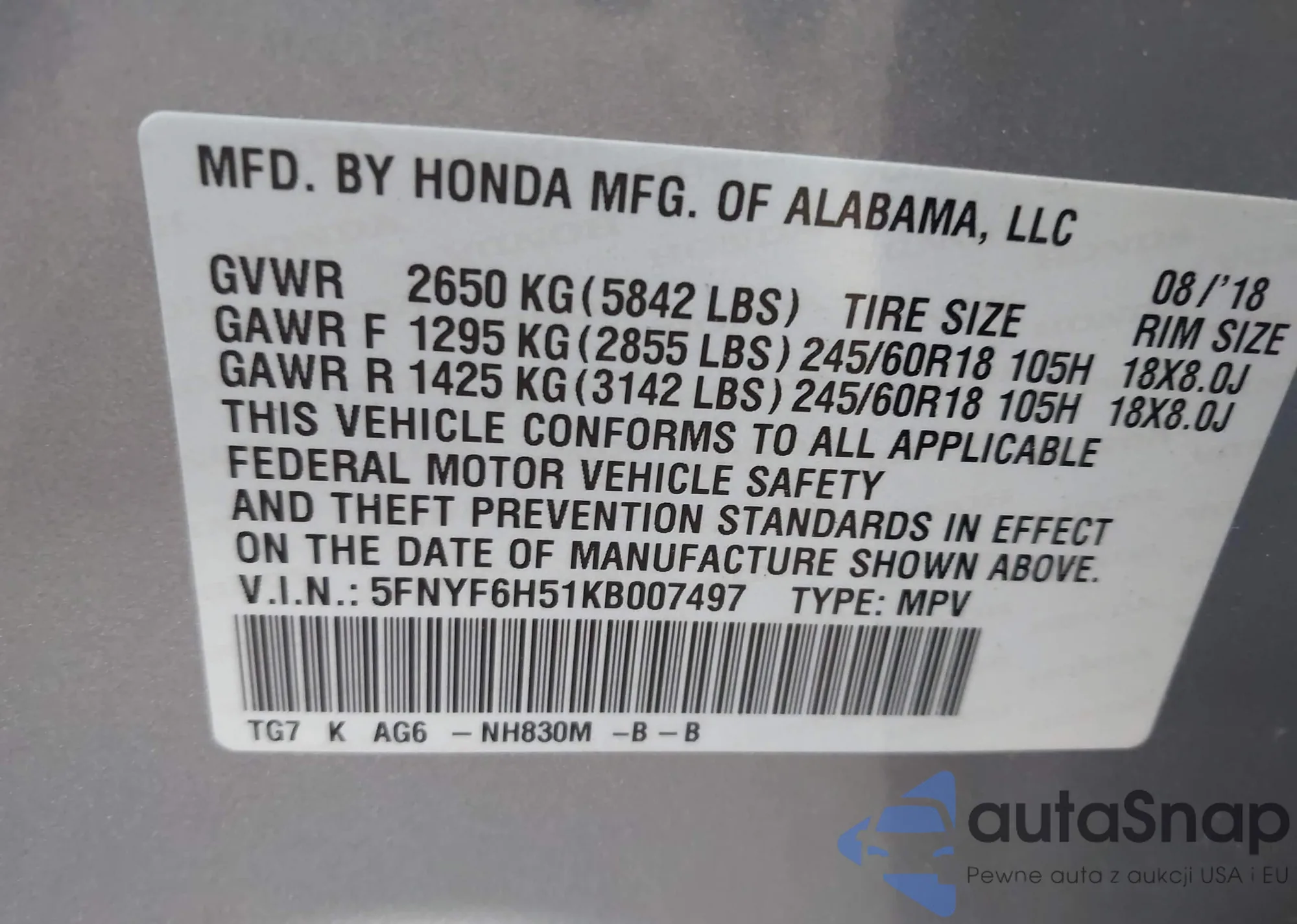 • VIN 5FNYF6H51KB007497