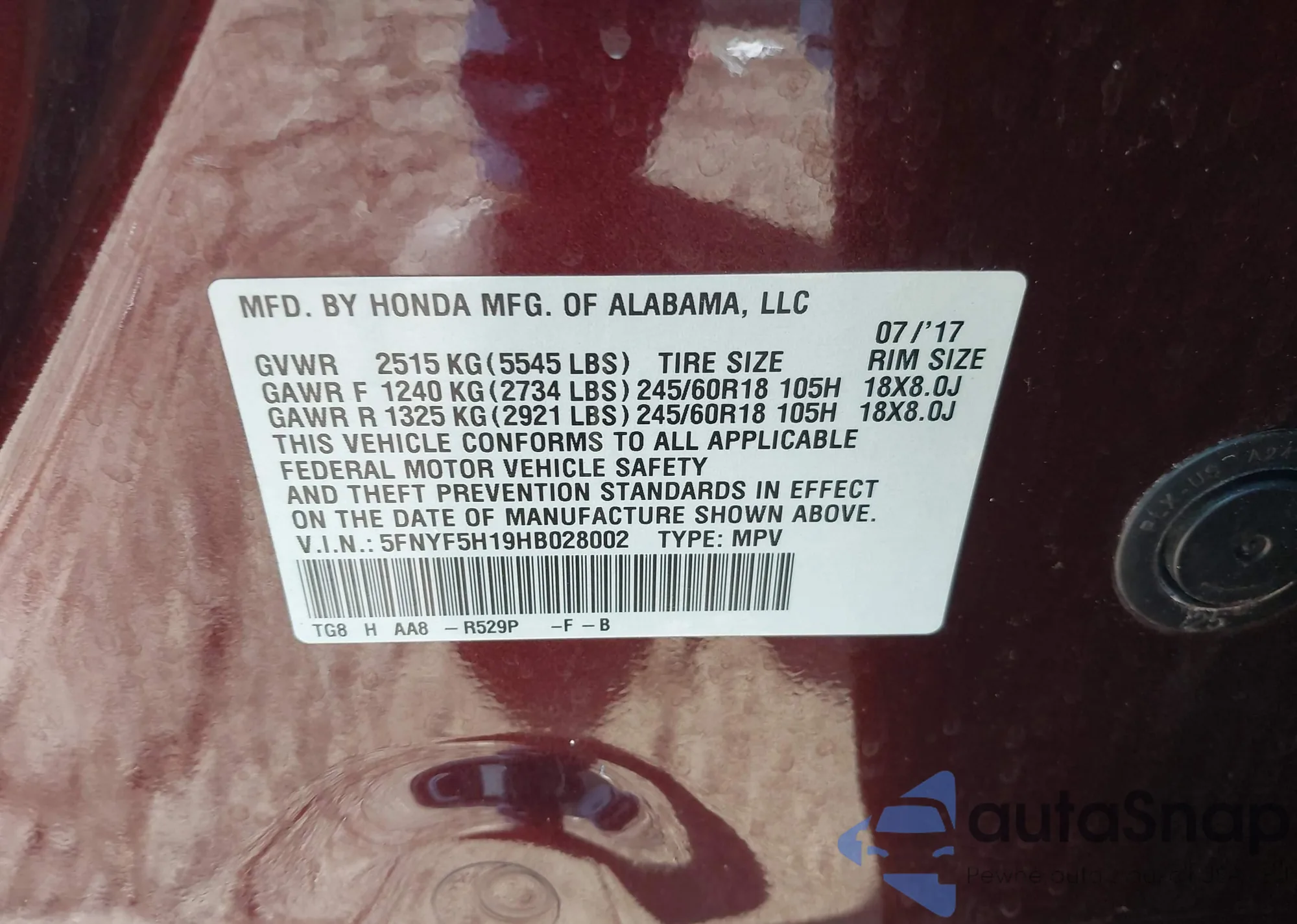 LOT: 44137178 VIN: 5FNYF5H58HB030861
