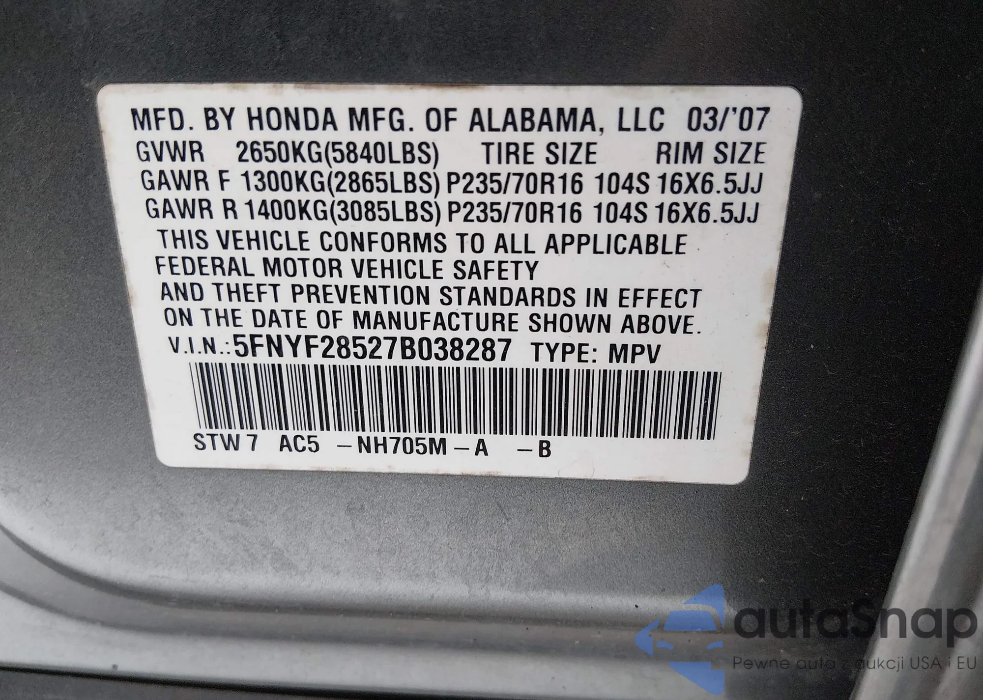 LOT: 44199956 VIN: 5FNYF28527B025233