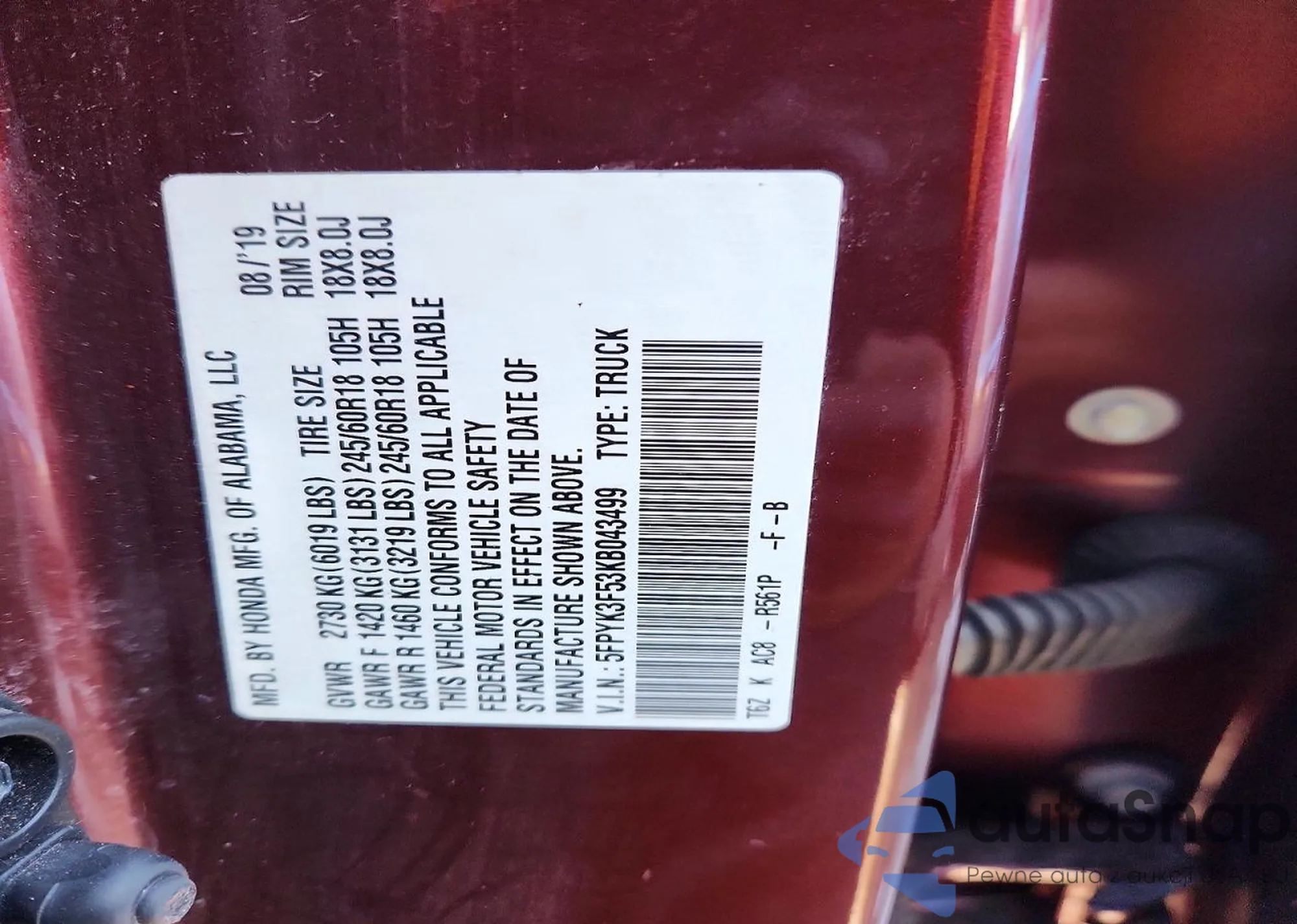 • VIN 5FPYK3F87KB013318