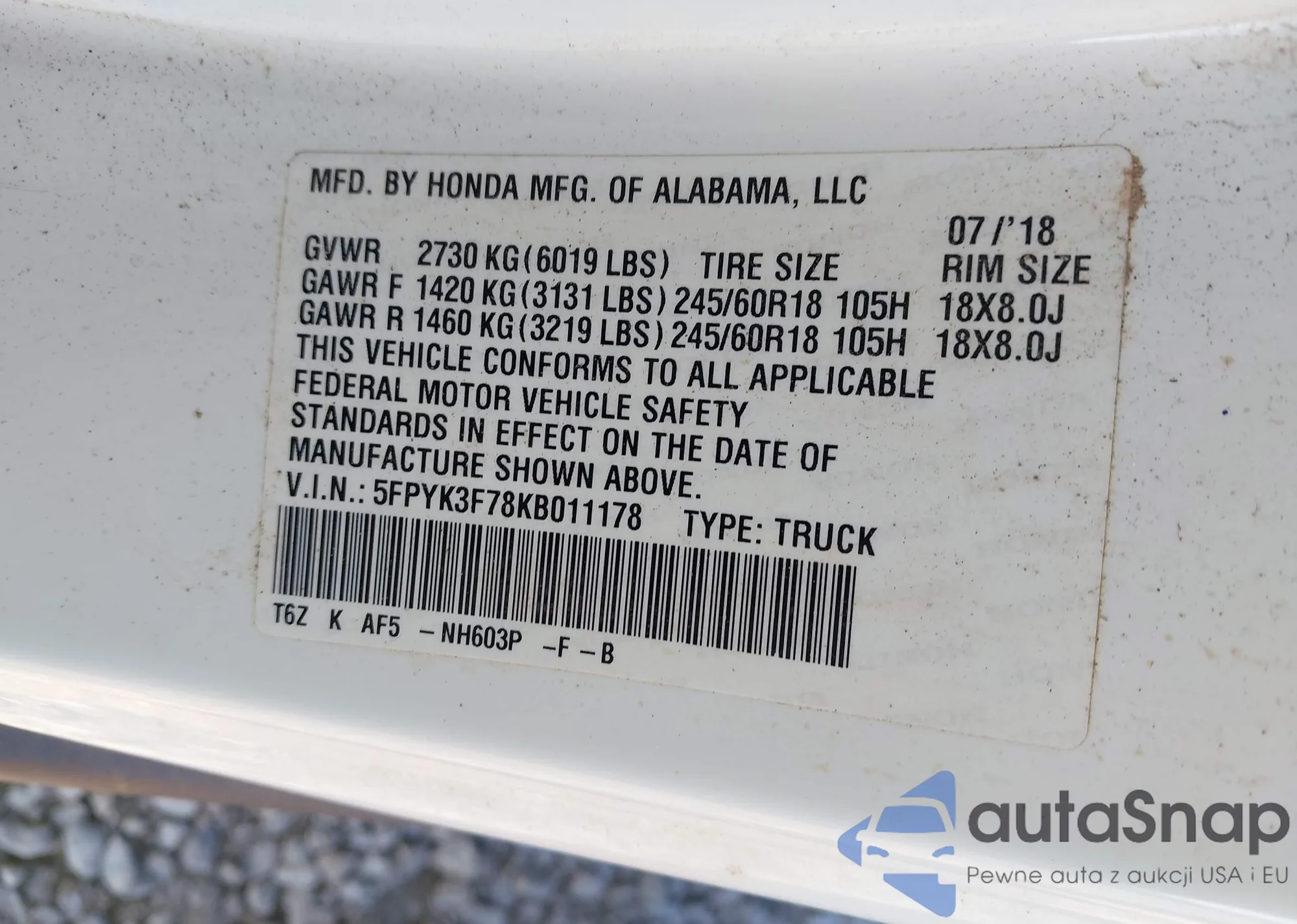 • VIN 5FPYK3F78KB011178