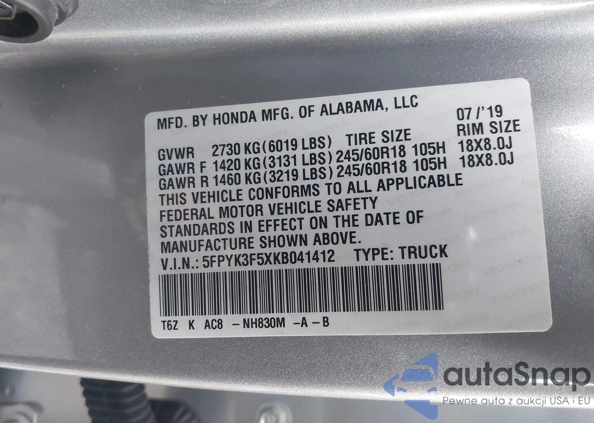 LOT: 44150760 VIN: 5FPYK3F5XKB041412