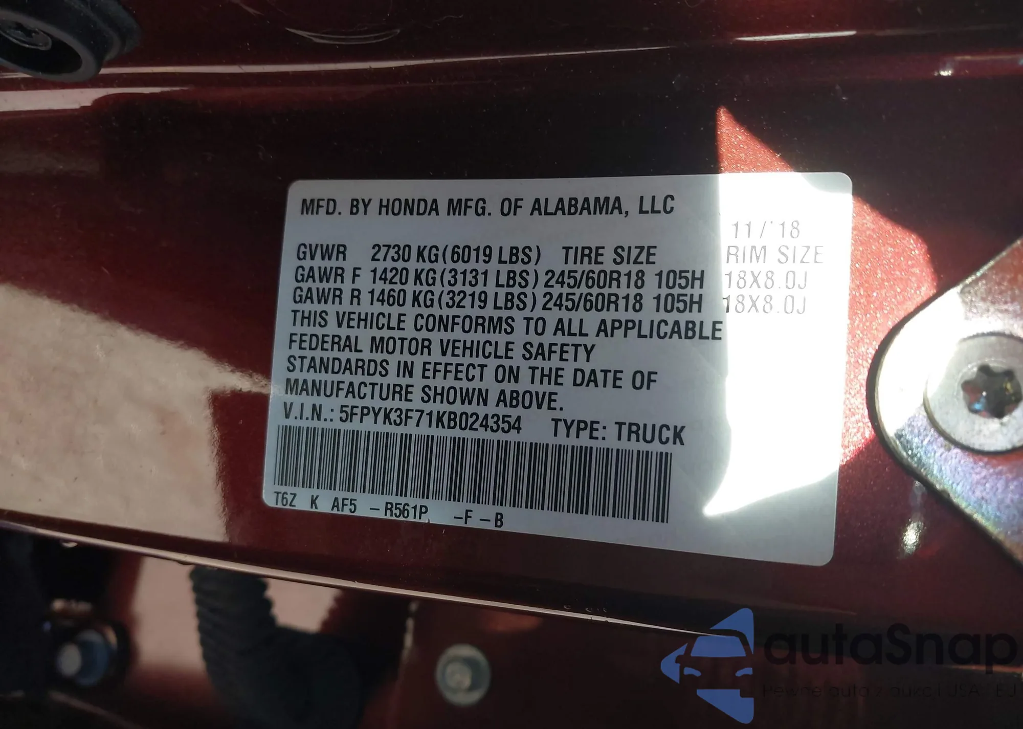 • VIN 5FPYK3F71KB024354