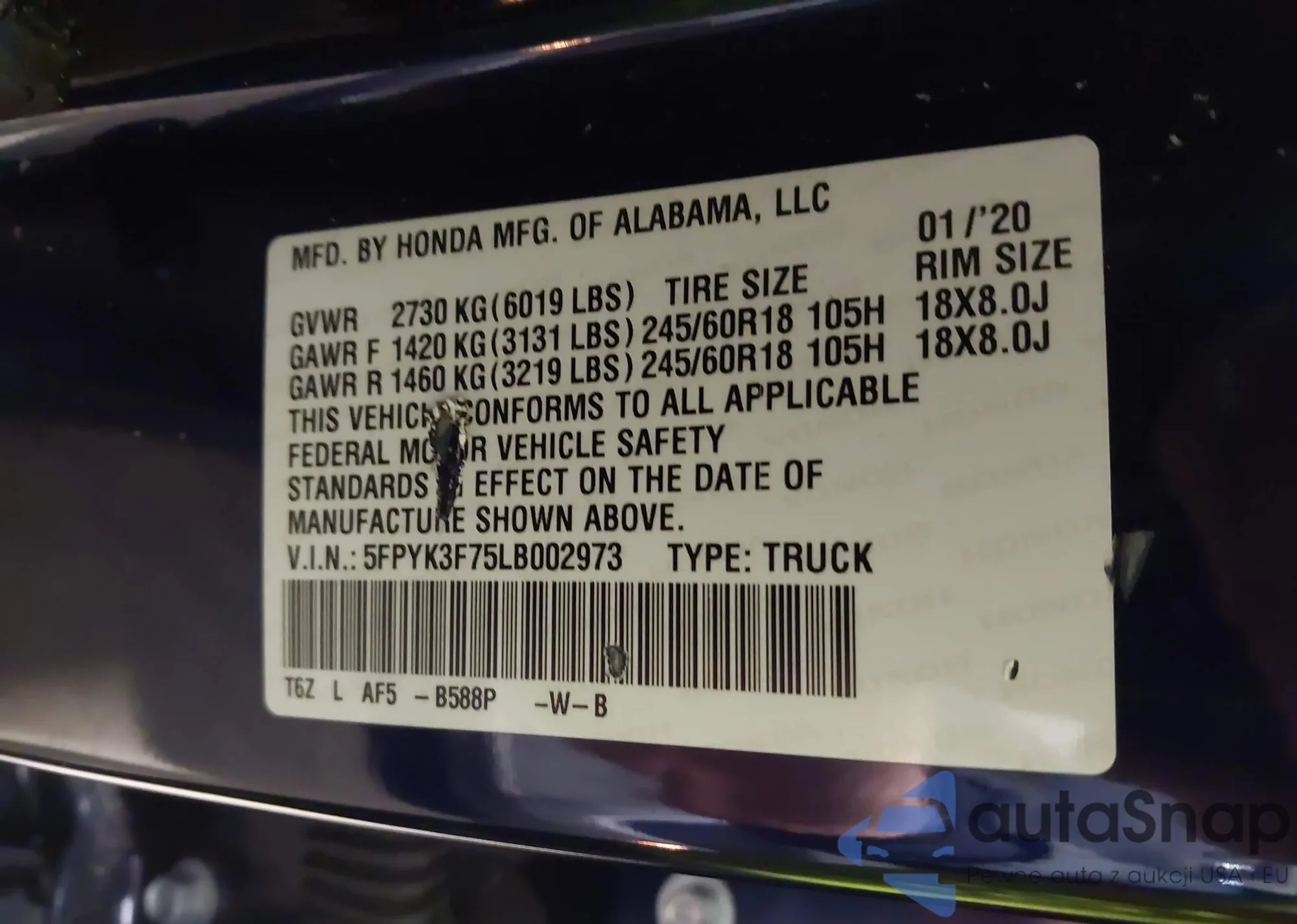 • VIN 5FPYK3F75LB002973