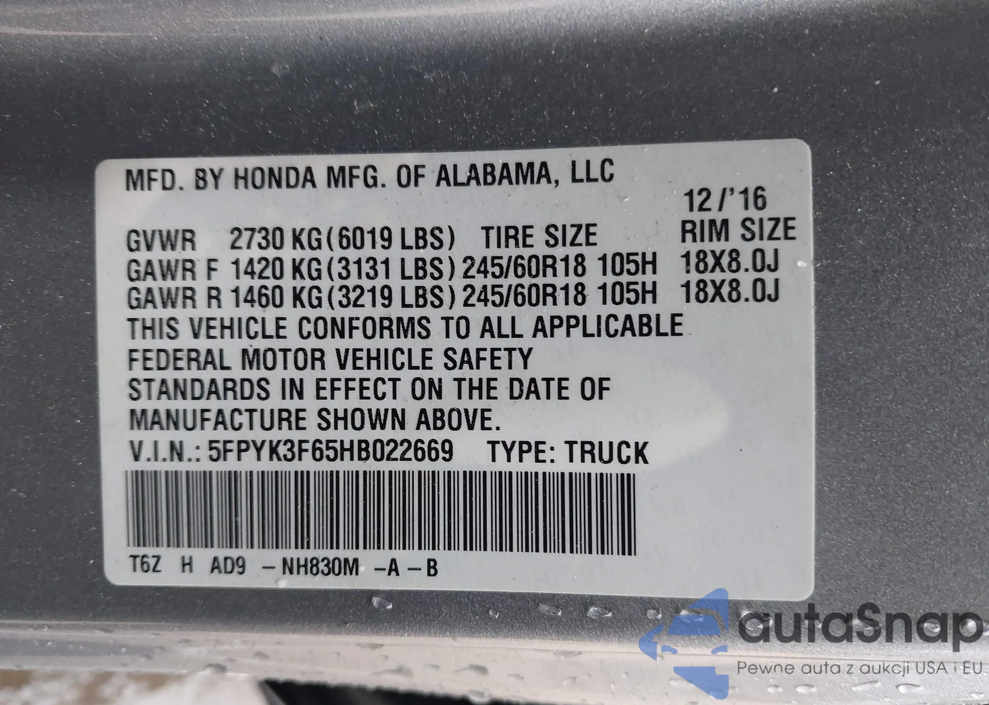 • VIN 5FPYK3F65HB022669