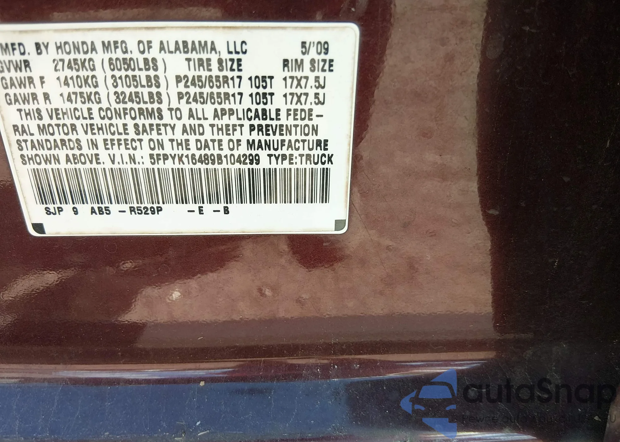 • VIN 5FPYK16489B104299