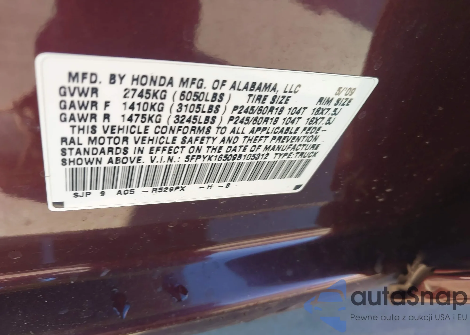 • VIN 5FPYK16509B105312