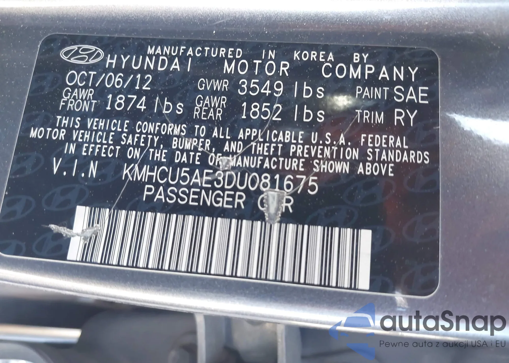 • VIN KMHCU5AE3DU081675