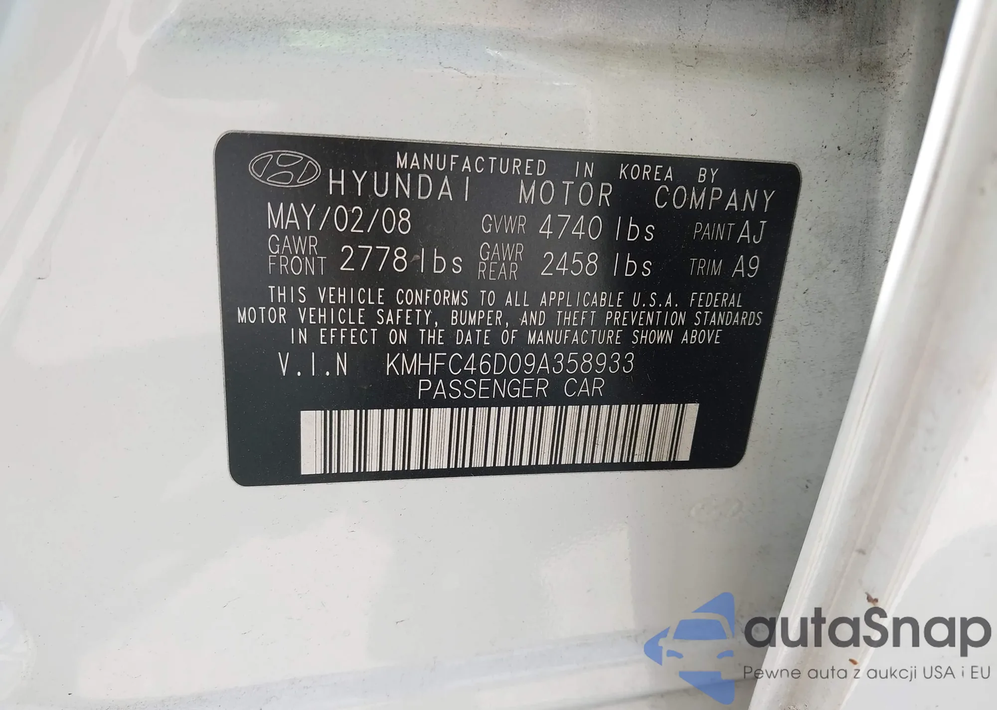 LOT: 44606393 VIN: KMHFC46F19A358148