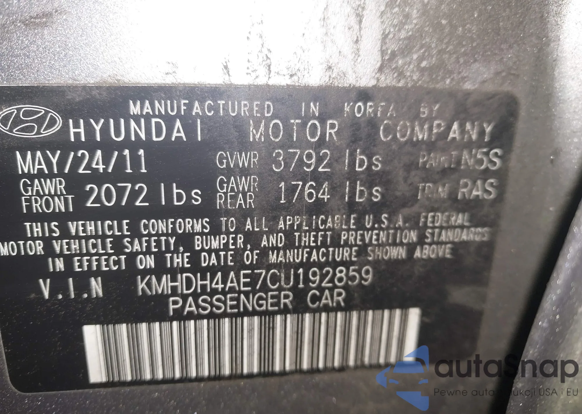 LOT: 44172575 VIN: KMHDH4AE7CU192859