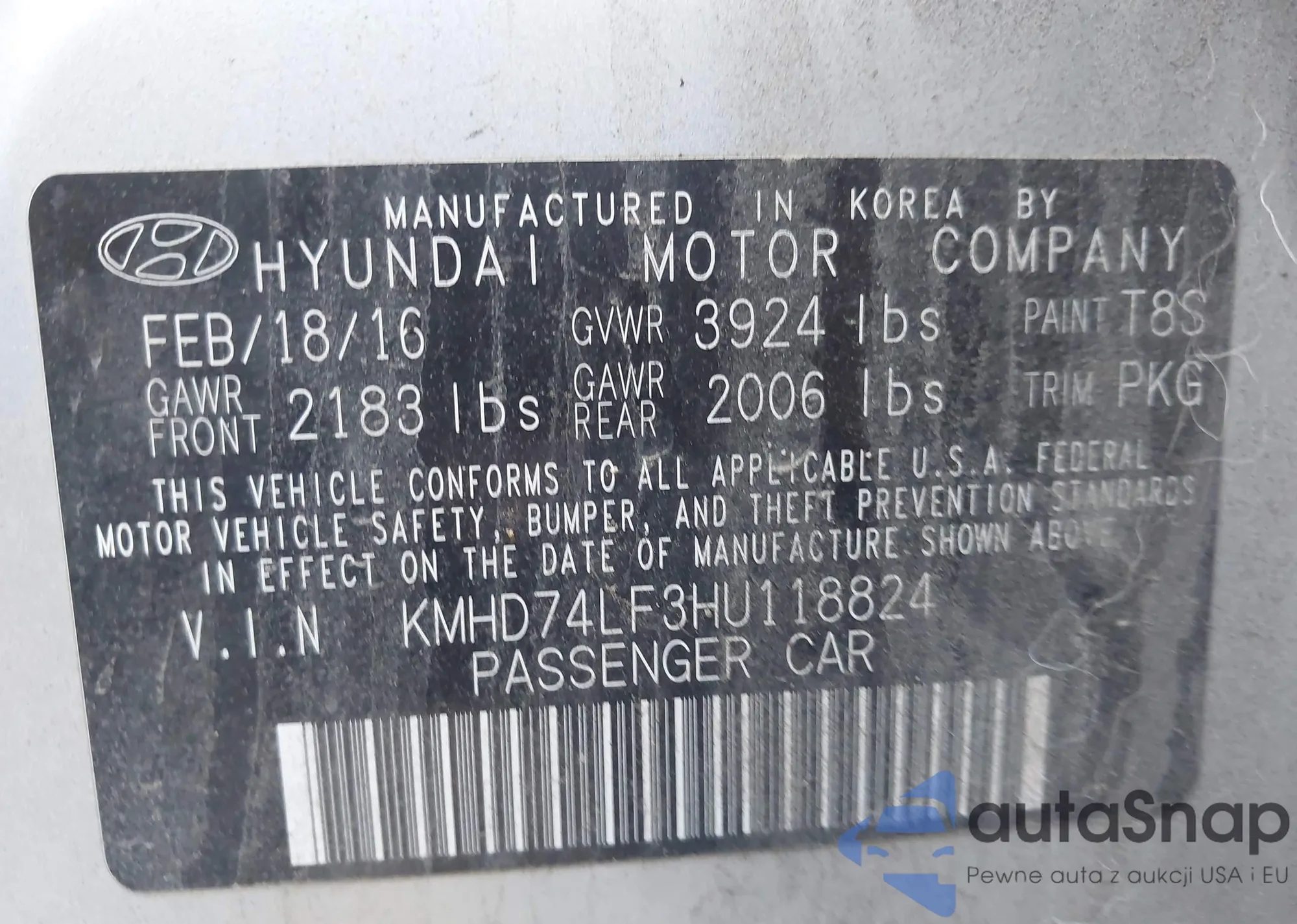 LOT: 44351219 VIN: KMHD84LF3HU274312