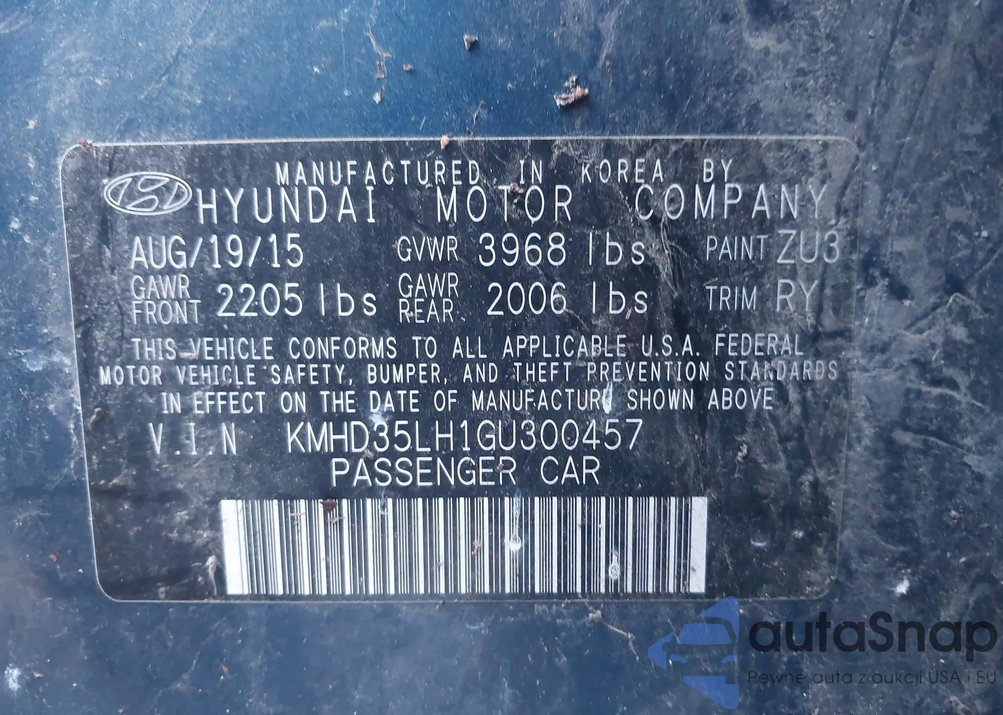 LOT: 44332346 VIN: KMHD35LH1GU300457