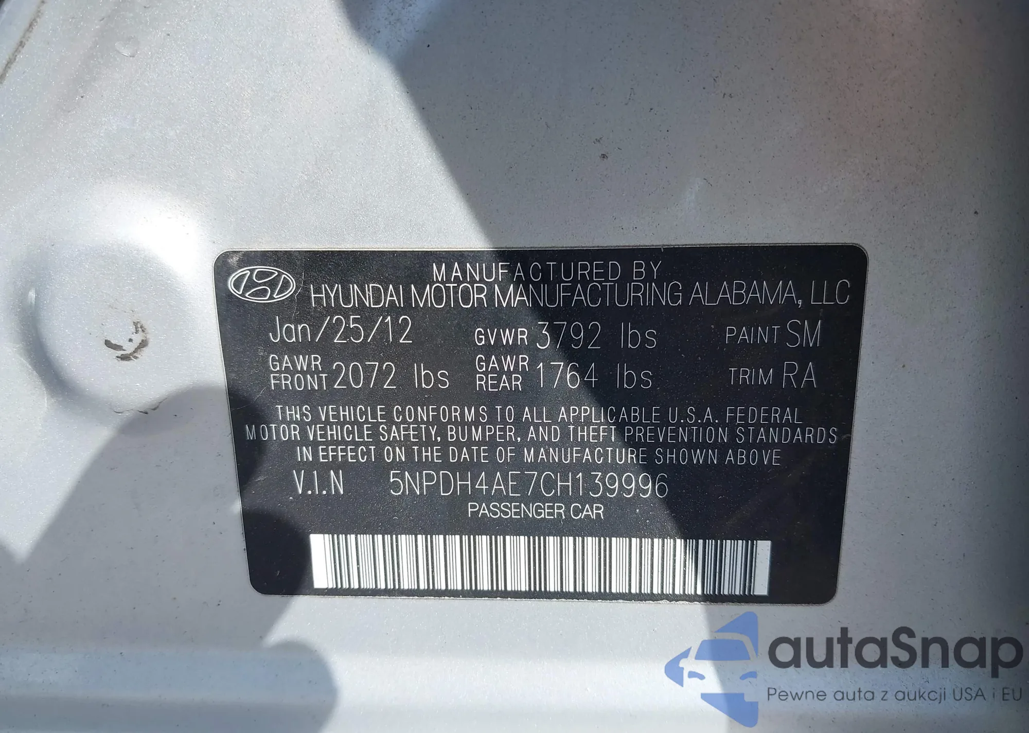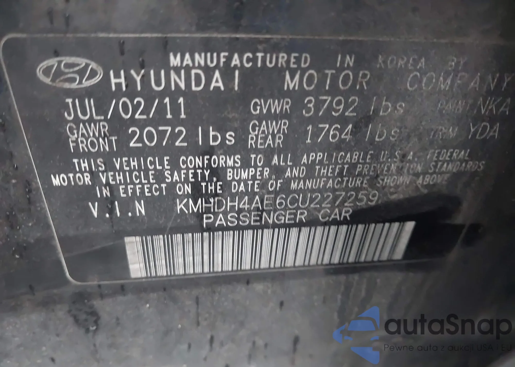 LOT: 38051714 VIN: KMHDH4AE6CU227259