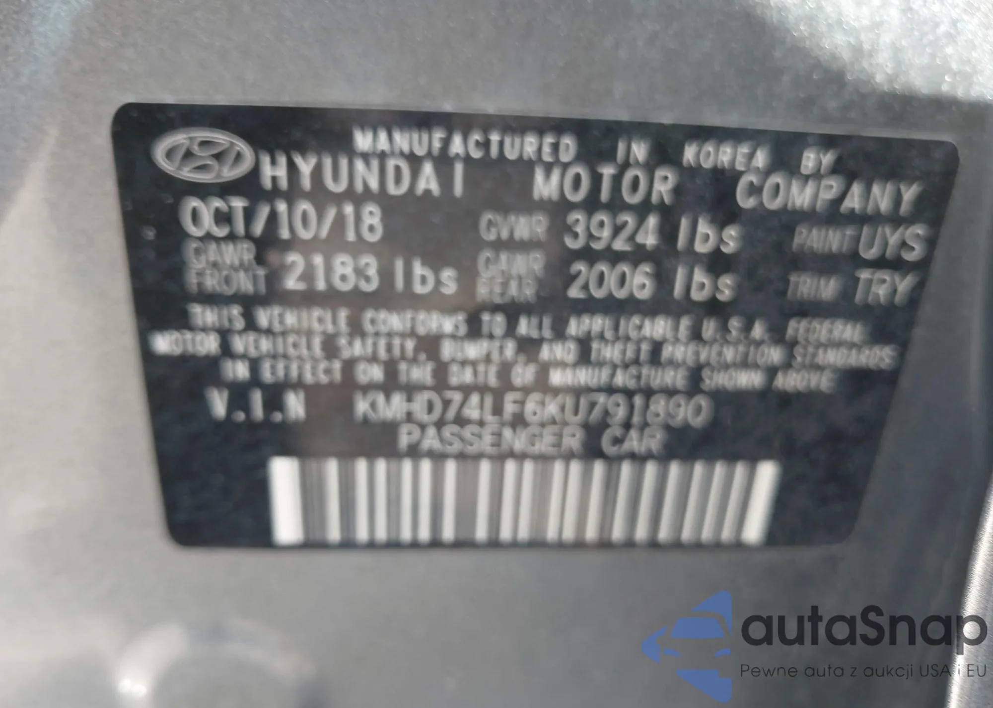 LOT: 44308490 VIN: KMHD74LF6KU791890